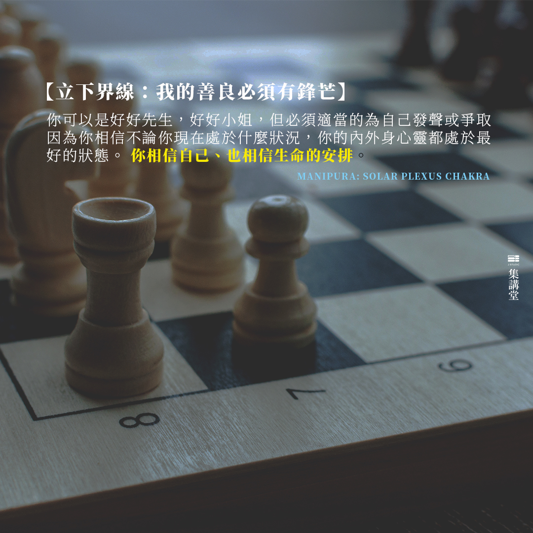 第三輪/太陽神經叢(本我輪):表現自信跟勇氣,立下界線,充分了解自我價值,不再壓抑、退縮