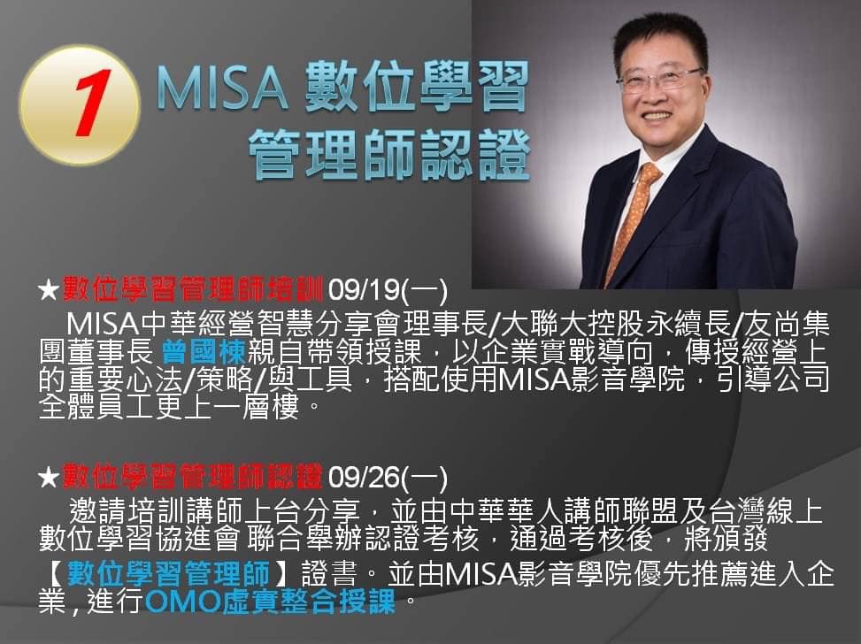 為了使企業主管更容易使用MISA影音學院的數位課程,在工作職場引導員工學以致用,特別與【中華華人講師聯盟】及【台灣線上數位學習協進會】合作,開辦「數位學習管理師培訓/認證計畫」,希望培養更多種子講師,協助企業導入及使用數位課程。