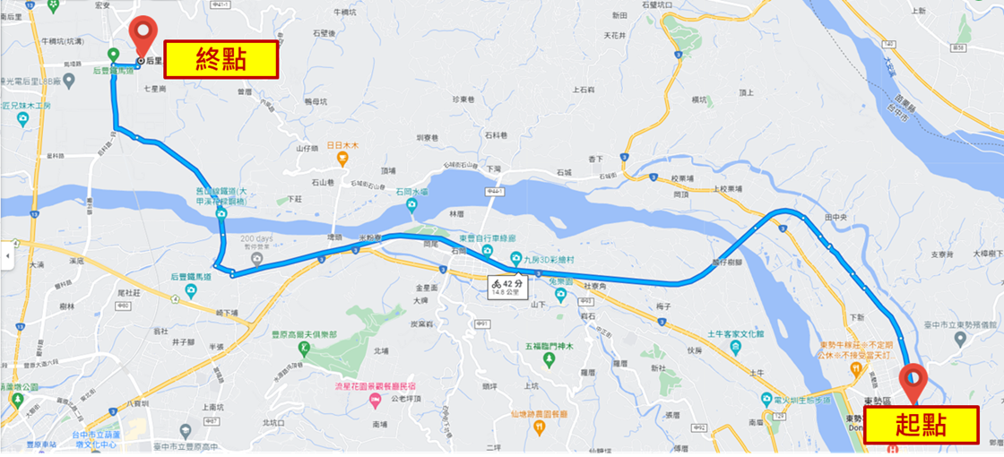 ●東勢客家文化園區→東豐自行車綠廊→后豐鐵馬道→大甲溪花樑鋼橋→九號隧道→后里馬場(約14.8KM)。