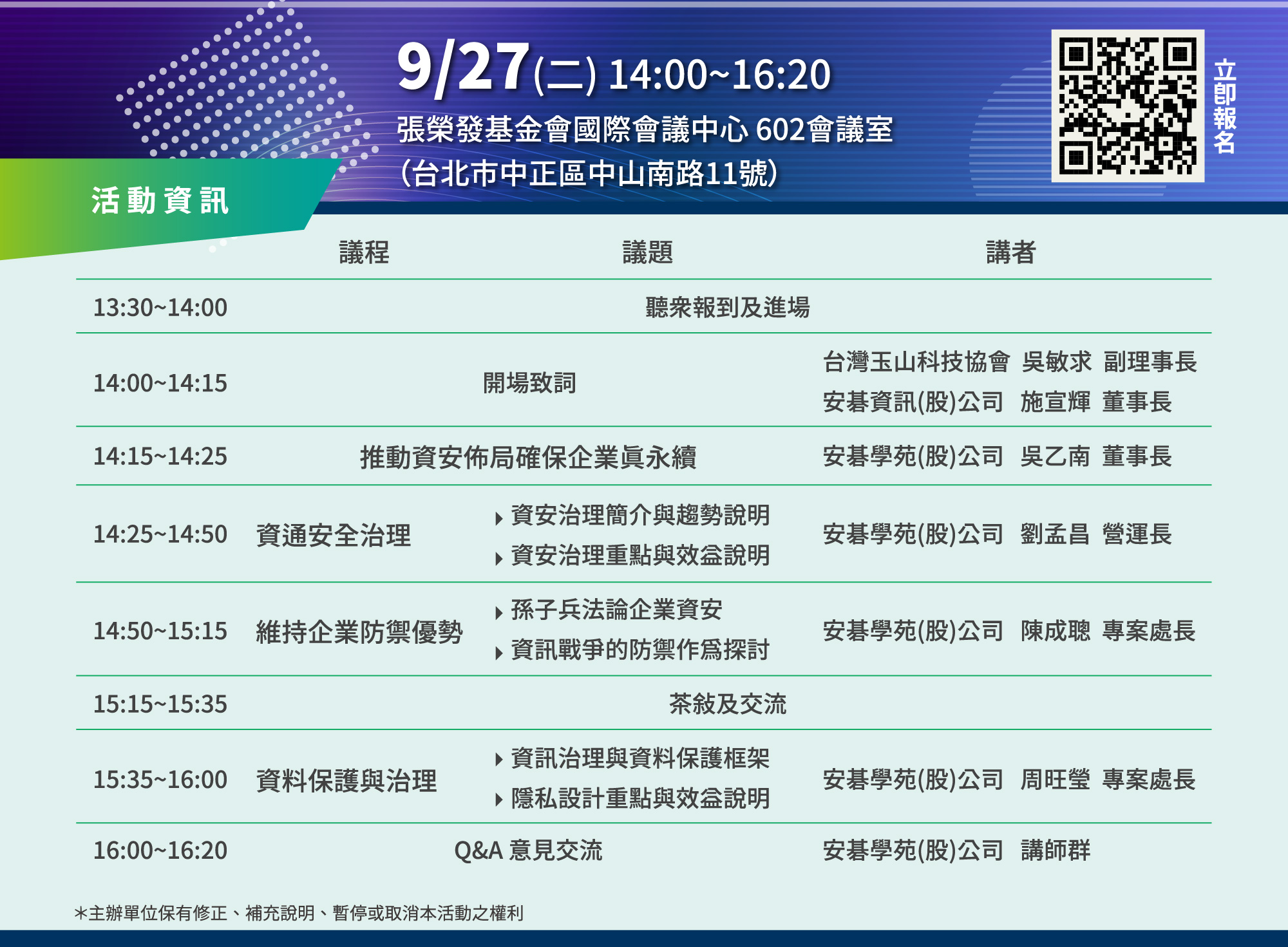 為此,【台灣玉山科技協會】與【安碁資訊(股)公司】特別辦理資安論壇,由【安碁學苑】講師群從資安治理的角度,探討企業挑戰與對策,並且分享資安防禦及資料保護治理框架實務做法,透過企業整體資安的設計與規劃,和資訊風險決策的敏捷作法,以其協助企業提升治理單位對資訊安全狀態的可視性,進行更有效的資訊安全管理與投資,並使企業得以遵循外部要求,貢獻價值與治理單位及其利害相關者,以達到企業永續發展的韌性。