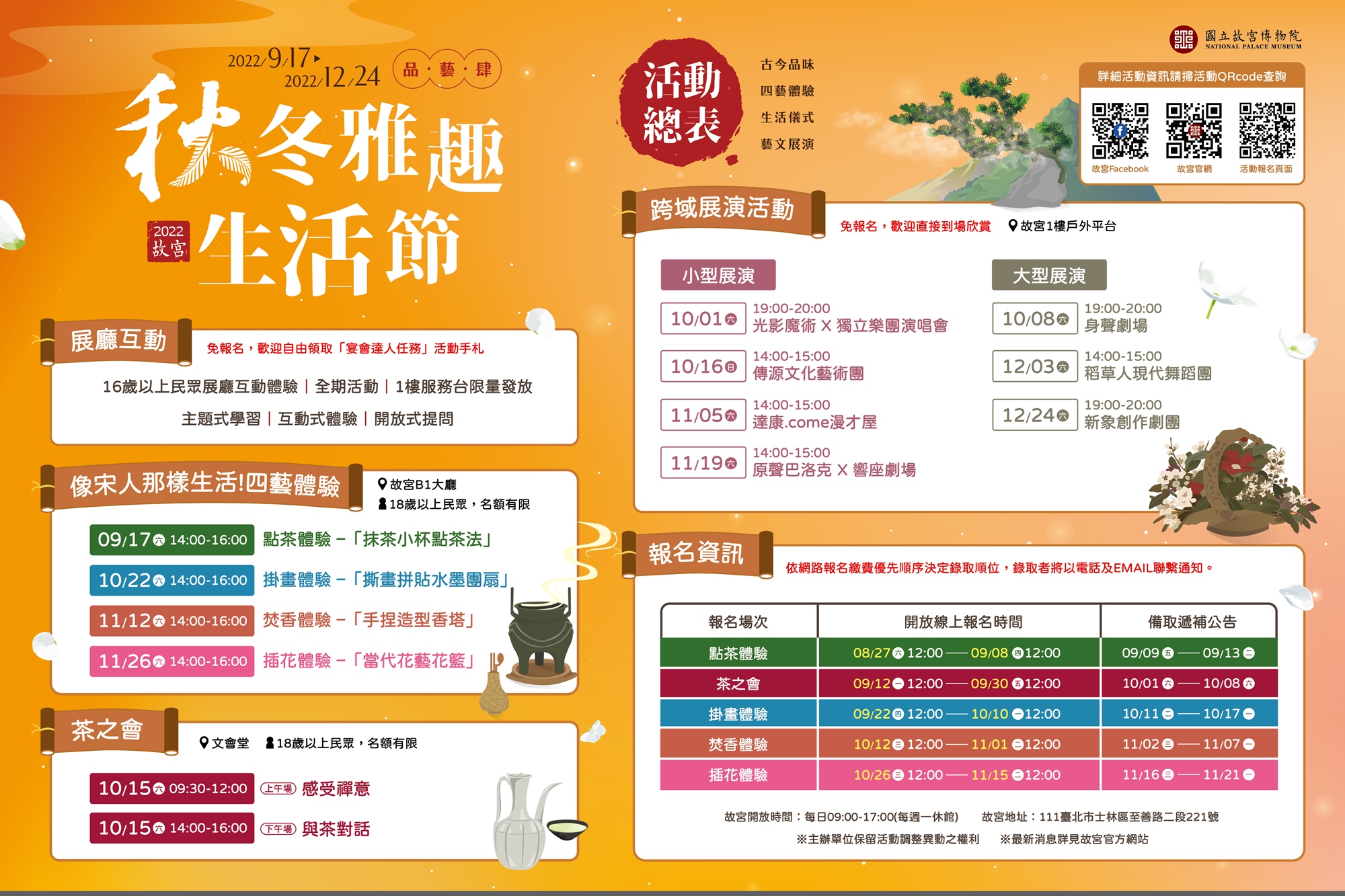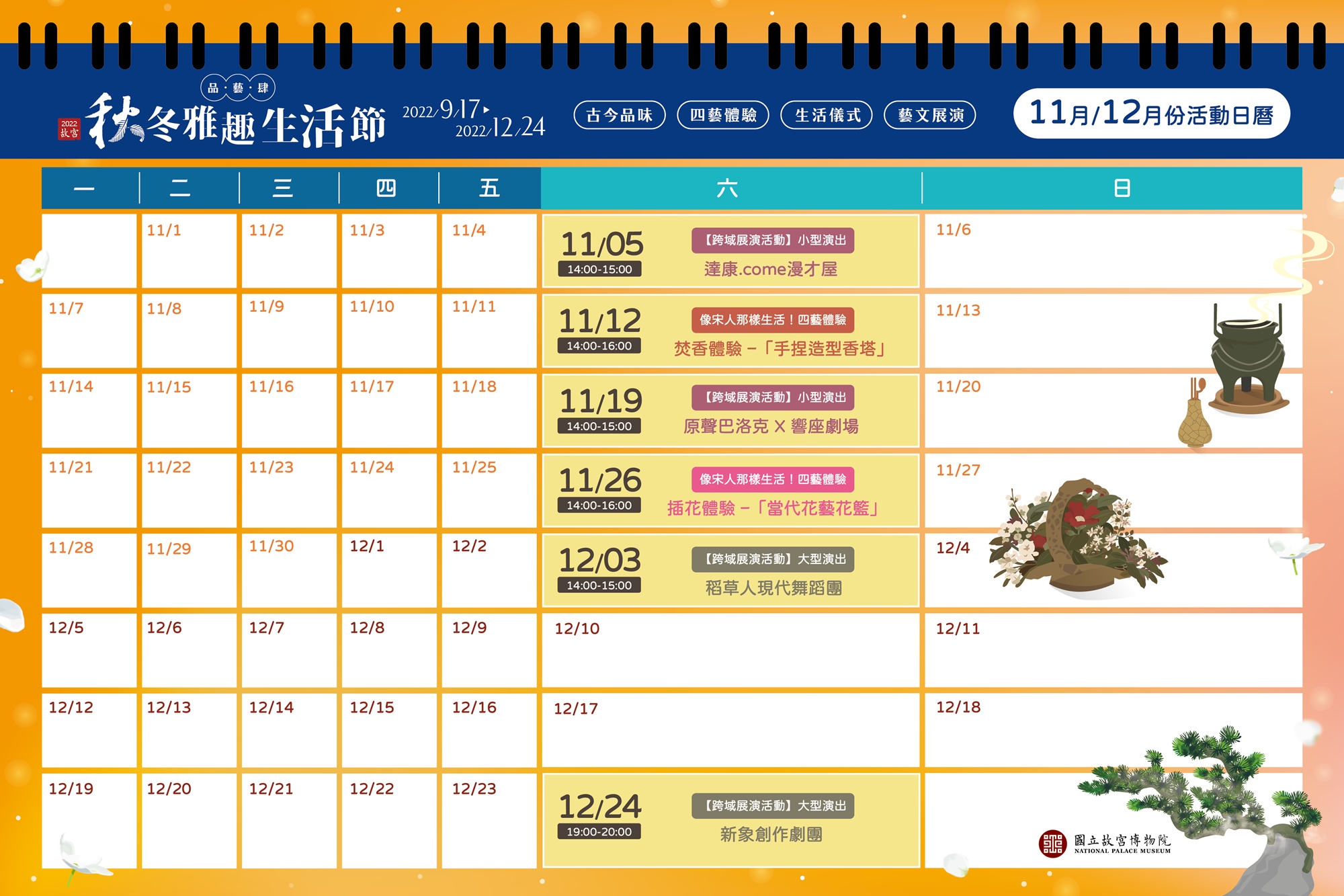 👉趕快收藏「2022故宮秋冬雅趣生活節—品.藝.肆」的活動行事曆,一起將日常生活昇華至藝術境界!