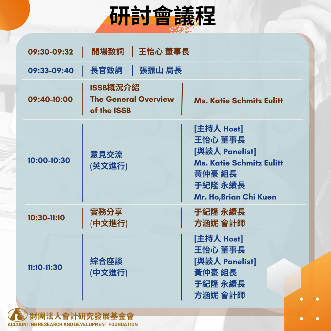 而IFRS基金會也於今年8月1日宣布完成將價值報導基金會(VRF)併入IFRS基金會。VRF所制定的SASB準則,已是我國永續報告編製的依循,未來將依上市櫃公司產業別,揭露具備公司財務重大性及投資決策有用性之ESG資訊。因此,本場研討會邀請IFRS基金會成員Ms. Katie Schmitz Eulitt,說明ISSB的現況,以及ISSB徵求意見稿的初步審閱。