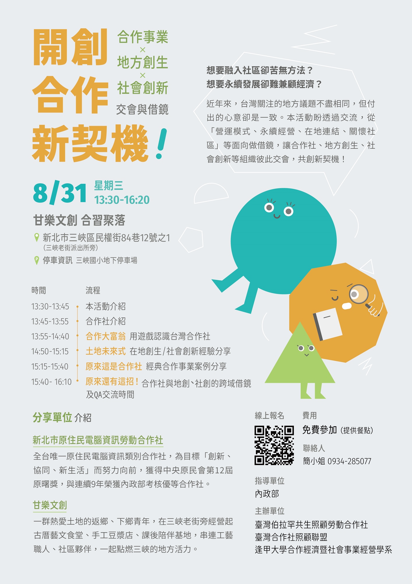 機會來啦🎉 2022年8月31日星期三,伯拉罕將在甘樂文創 合習聚落辦理 合作事業X地方創生 交流活動。將「營運模式、永續經營、在地連結、關懷社區」等面向一網打盡,讓合作社、地方創生組織彼此交會,一兼二顧,共創地方發展新契機!