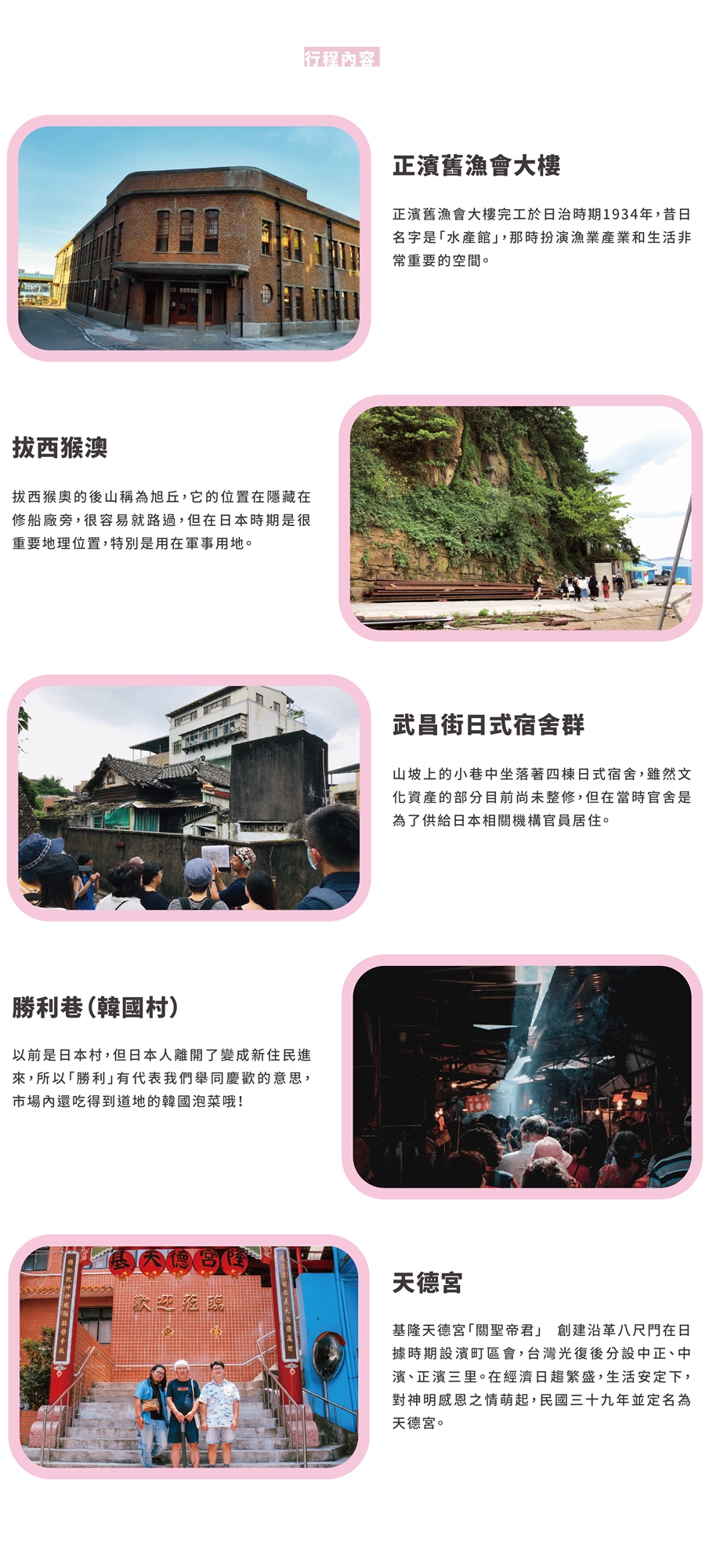正濱漁港的港邊,埋藏了許多殖民國留下的建築,以及逐漸被遺忘的故事。這次我們不走港邊,選擇往山上走去,過去正濱因日本殖民時期,戰後留下些許的韓國人們,定居於此生活,現在仍可在基隆韓國教會、勝利巷市場(韓國村)探尋他們的蹤跡。你知道過去正濱漁港的繁榮過往嗎 ? 因此除了韓國人、日本人,昔日的漢人也在此生根和工作,同時也發展了他們的信仰。不同族群融合在一起,會激發甚麼新滋味呢 ?邀請你一同來品嚐山中故事 !