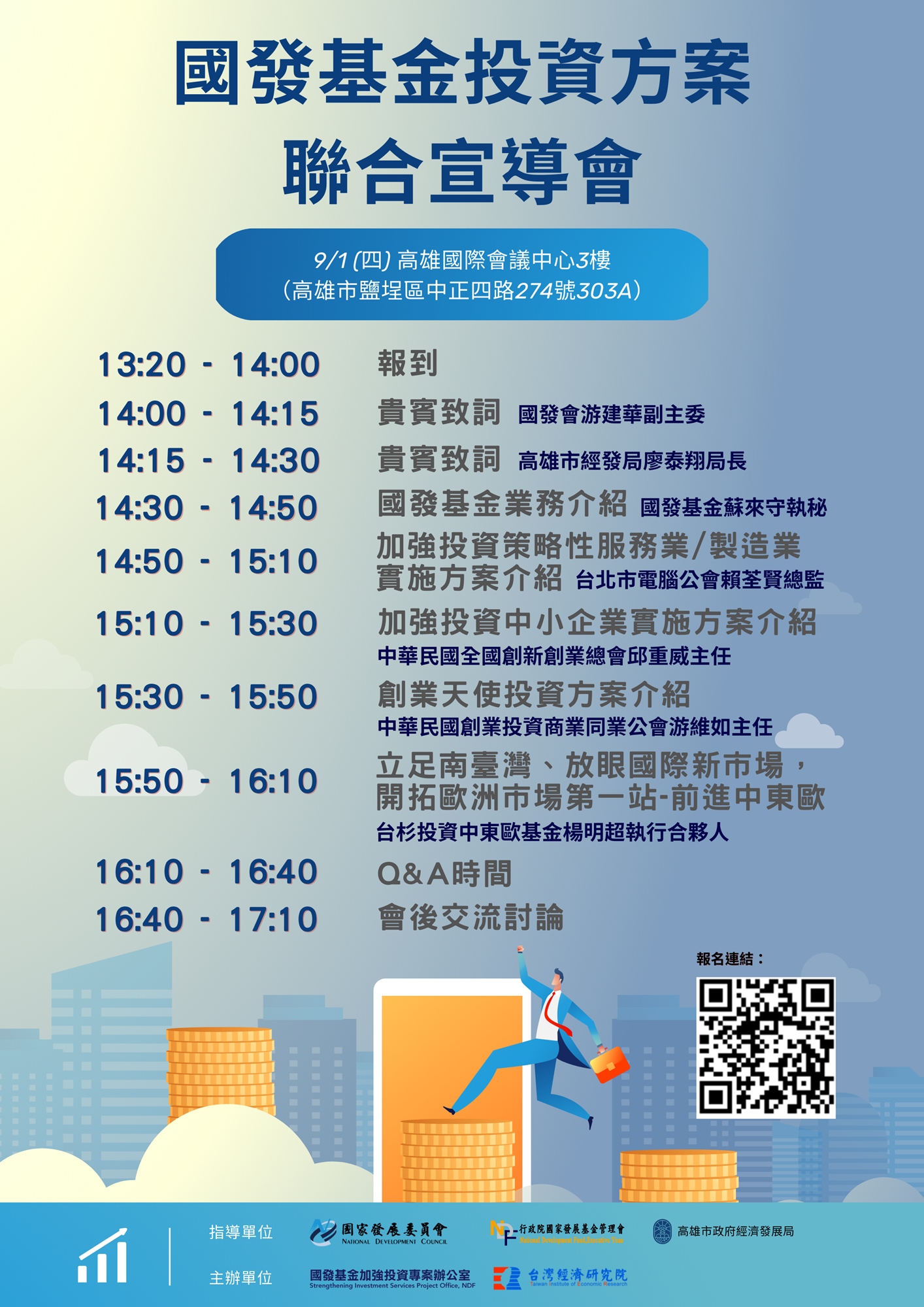 ☝️此次宣導會陣容堅強,隆重邀請#國發會游建華副主委、#高雄市經發局廖泰翔局長致歡迎詞,並邀請#國發基金蘇來守執秘領銜開場「國發基金業務介紹」;亦分別邀請#各方案負責人說明「加強投資策略性服務/製造業實施方案」、「加強投資中小企業實施方案」、「創業天使投資方案」、「中東歐基金」,鑑於企業產業發展階段不同,資金需求、申請原則及時施流程亦有所差異,誠摯邀業界先進共襄盛舉。