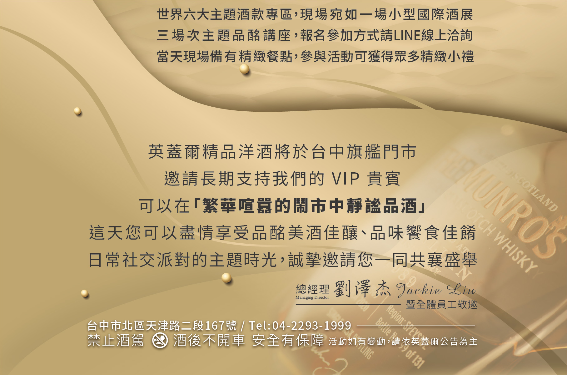在這場【靜x覓|VIP酒窖品酩日】英蓋爾精品洋酒-台中旗艦門市現場將以酒展概念呈現,設置「世界六大主題」品飲專區,宛如世界巡迴酒展,開放民眾自由參觀品酩!