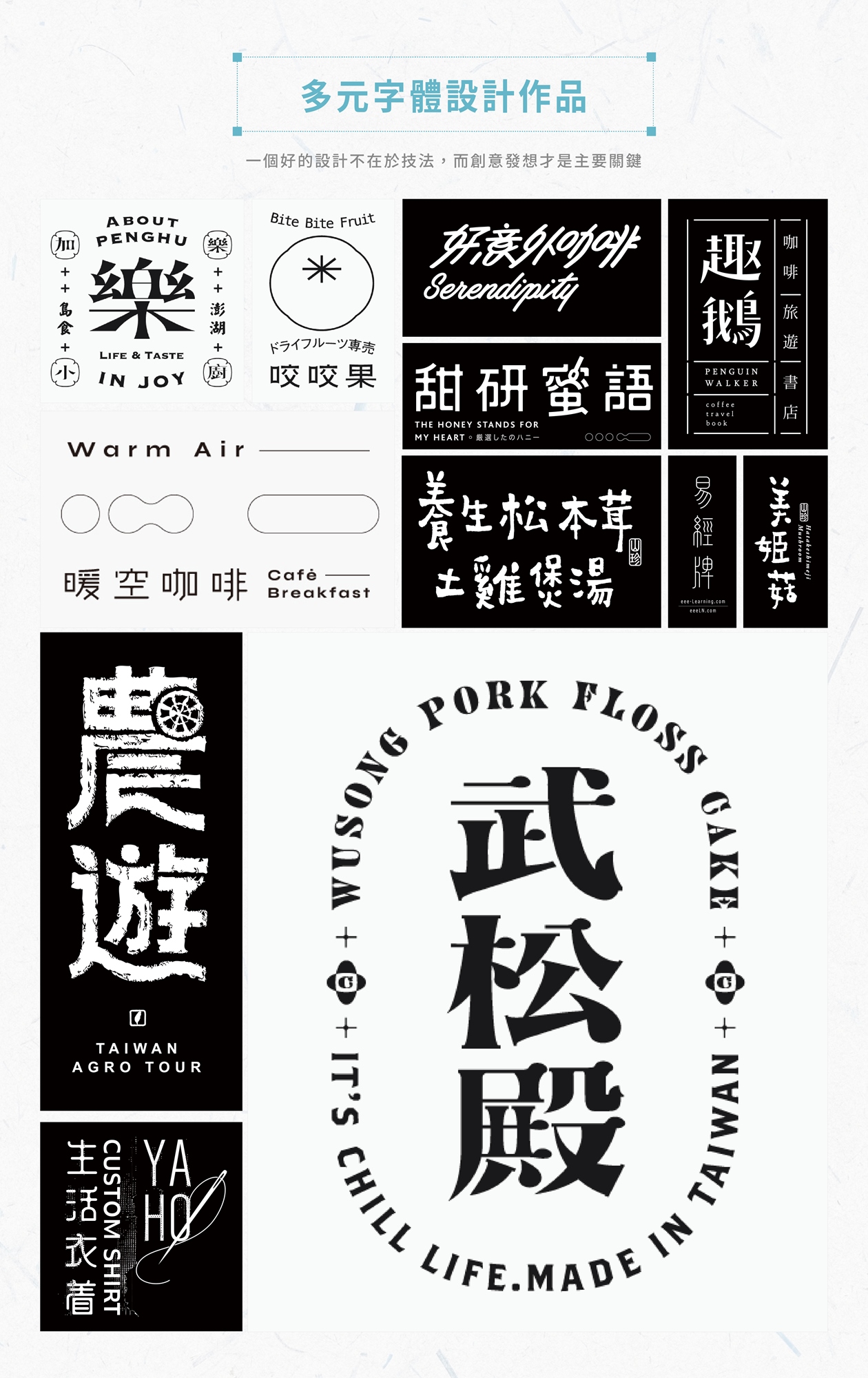 ● 精通於品牌形象設計、包裝設計、廣告設計、字體等設計範疇