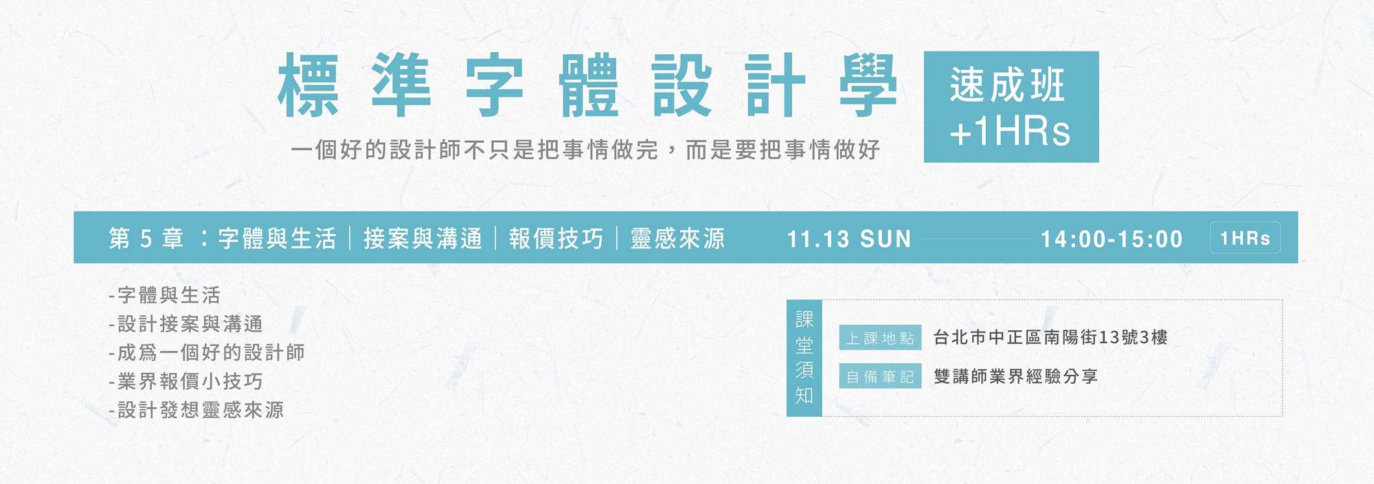 - 2022.11.12 Sat / 14:00~21:00(授課6HRs+ 休息時間1HR)