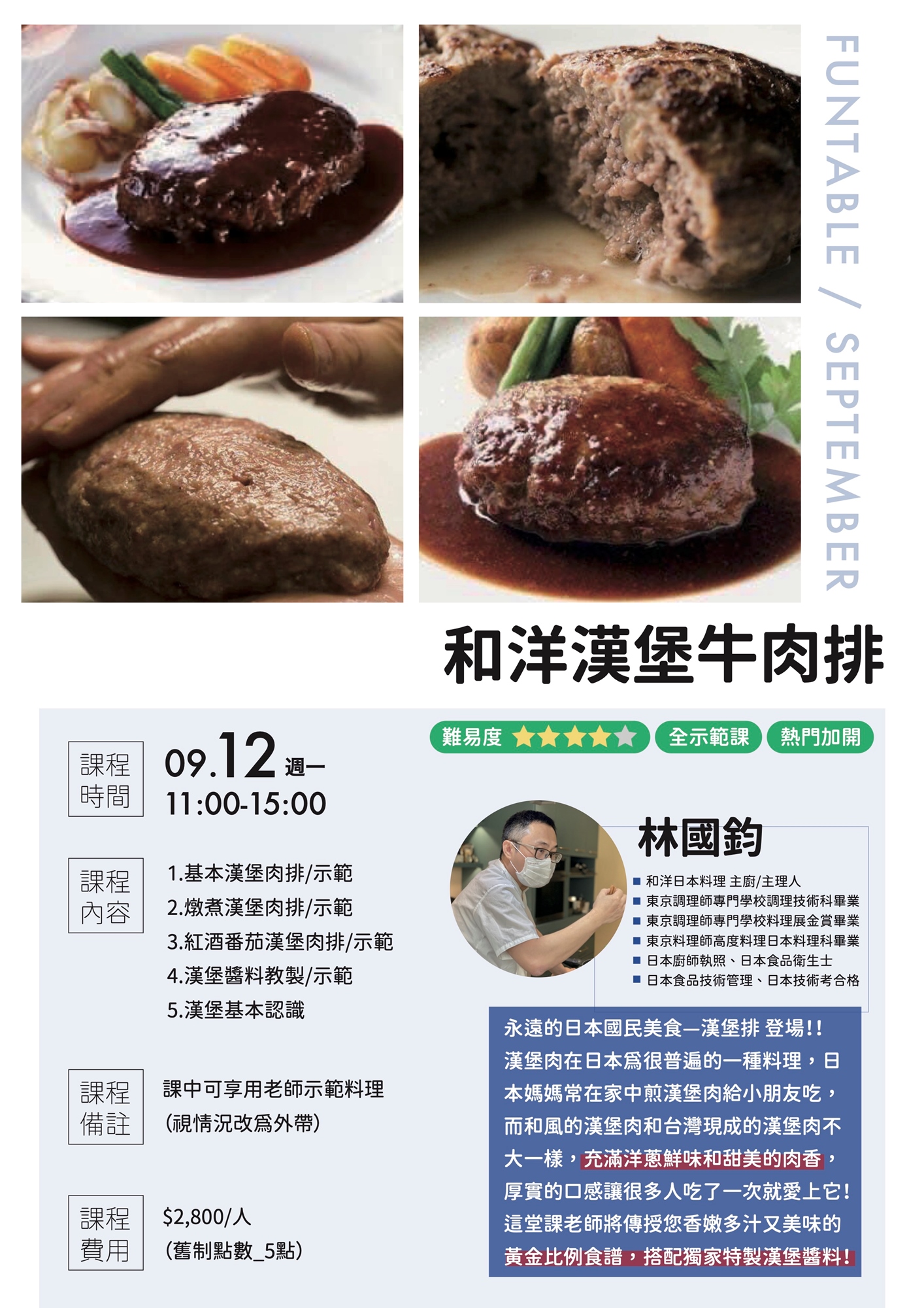 這堂課老師將傳授您香嫩多汁又美味的黃金比例食譜,搭配獨家特製漢堡醬料!