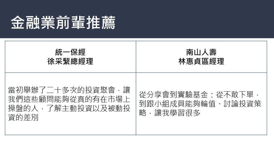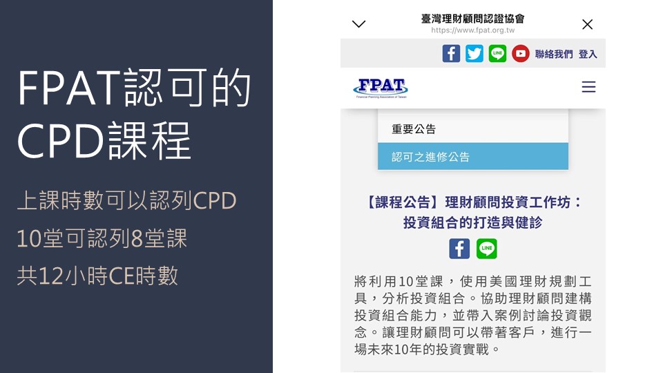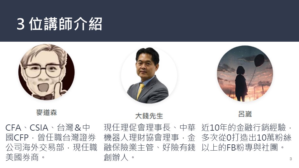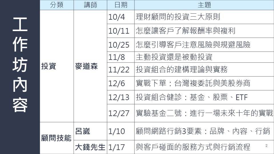 備註:12/6、12/27課程中所推介分析之投資平台,無不當之財務利益關係且實戰部分為選修;理財顧問可獨立判斷、謹慎評估自身需求後再行決定是否參與。