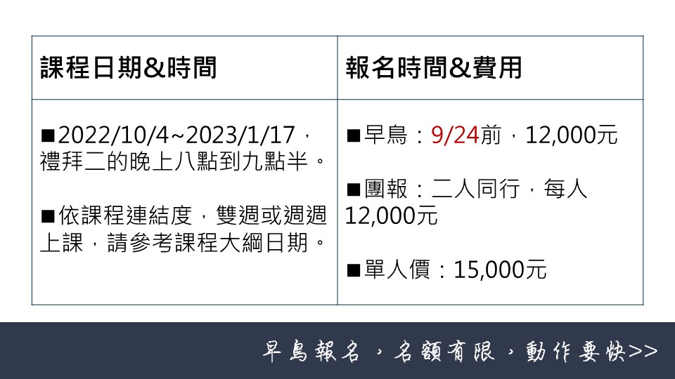 (報名至2022/9/30結束,若未達最低開課人數,或其他不可抗拒因素取消開課,將委請活動通退費。)