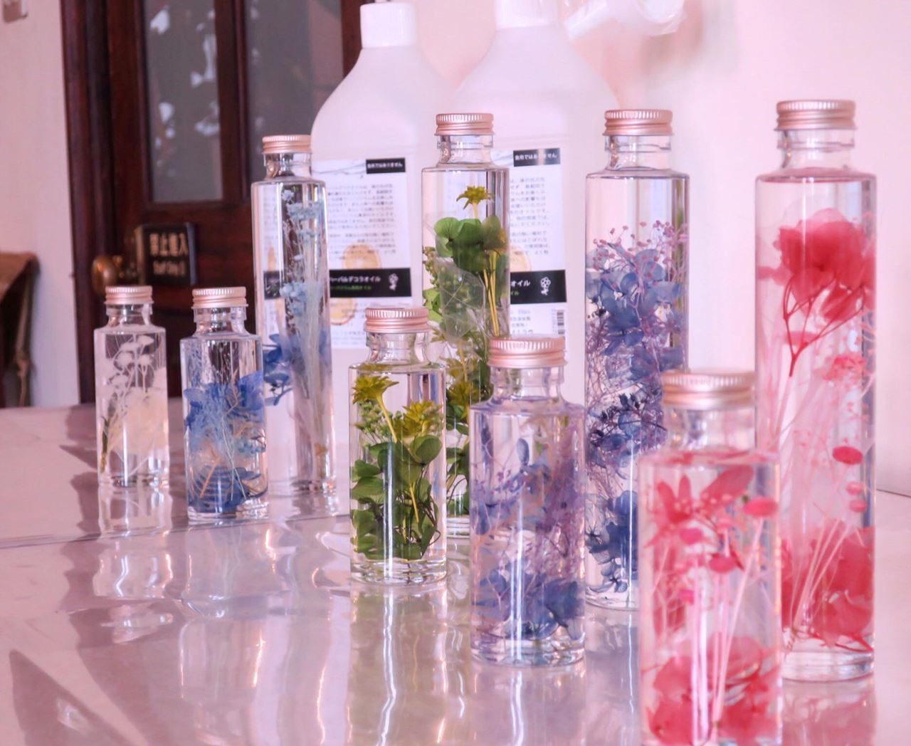 課堂上使用的為 日本進口的Herbal decola oil 浮油花製作油,是由日本石油提煉出來的純度較高的礦物油。以植物標本的做法,主要用來陳設觀賞用。