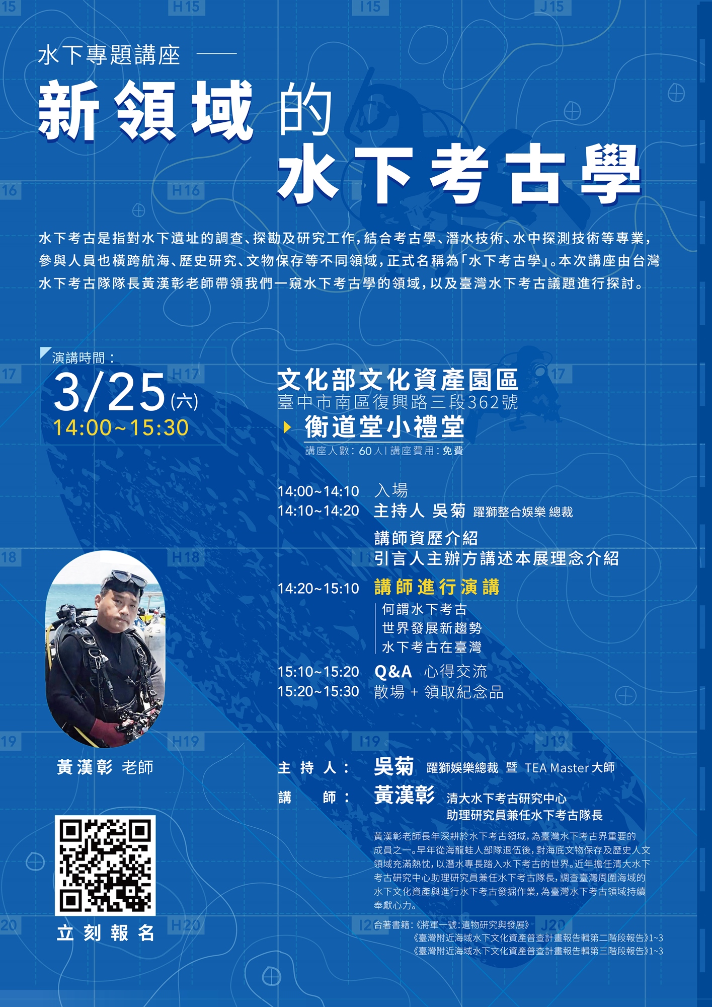 臺灣水下考古與水下文化資產的發展,來自於上個世紀1995年發現「將軍一號」沉船遺址後,歷時近三十年的光陰,透過許多學界專業人士共同努力,才讓大眾逐漸了解臺灣周圍海域具備豐富的水下文化資產與其價值!今年度舉行的「水下專題講座」,很榮幸能邀請兩位專家,針對水下考古與水下文化資產歷史議題進行探討,藉此機會帶給各位更豐富的內容。