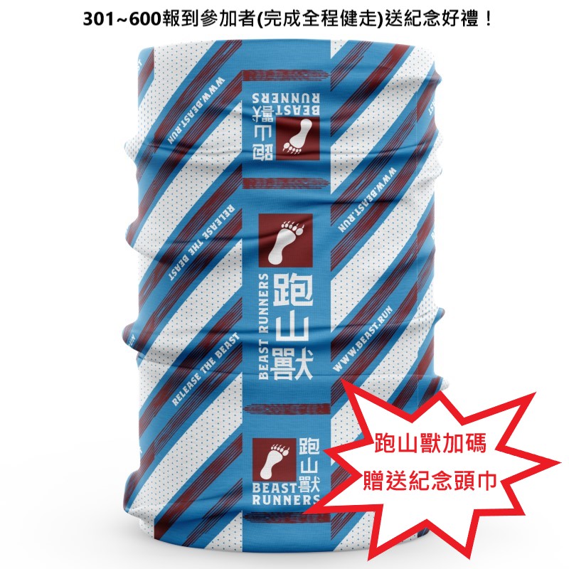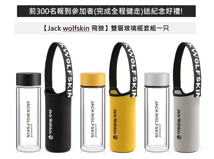 - 網路報名並於會場完成報到前300名可獲得Jack wolfskin 雙層玻璃瓶套組1只(款式顏色隨機發送),301~600名可獲得跑山獸頭巾1份,需完成全程健走活動才能領取。