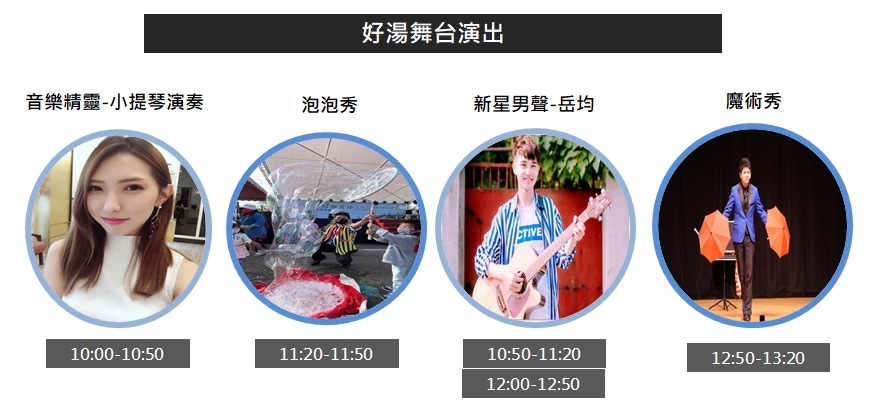 10:30-11:50 12:00-13:20 | 好湯舞台 (小提琴演奏/歌曲演唱/魔術/泡泡秀) |