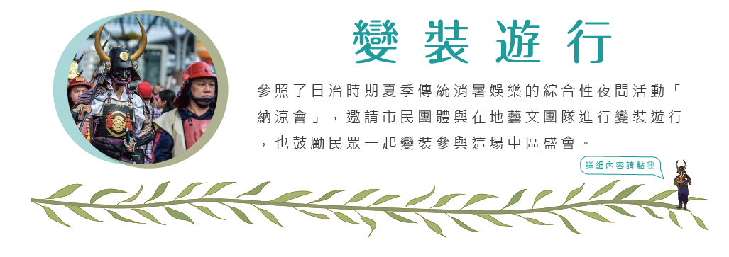 本活動參照了日治時期中部大地震後,在地店家為振興地區經濟,自主發起的變裝遊行,以及夏季傳統消暑娛樂的綜合性夜間活動「納涼會」,這個街區節慶活動,戰後由台中商會繼承並在台中公園主辦,目的在於增進工商業繁榮及提供市民休閒娛樂,透過夜市、遊行和化裝比賽等活動吸引廣大民眾的參與,帶動了街區的商業活動,為店家們帶來熱鬧的人潮,也讓市民們一同歡樂。