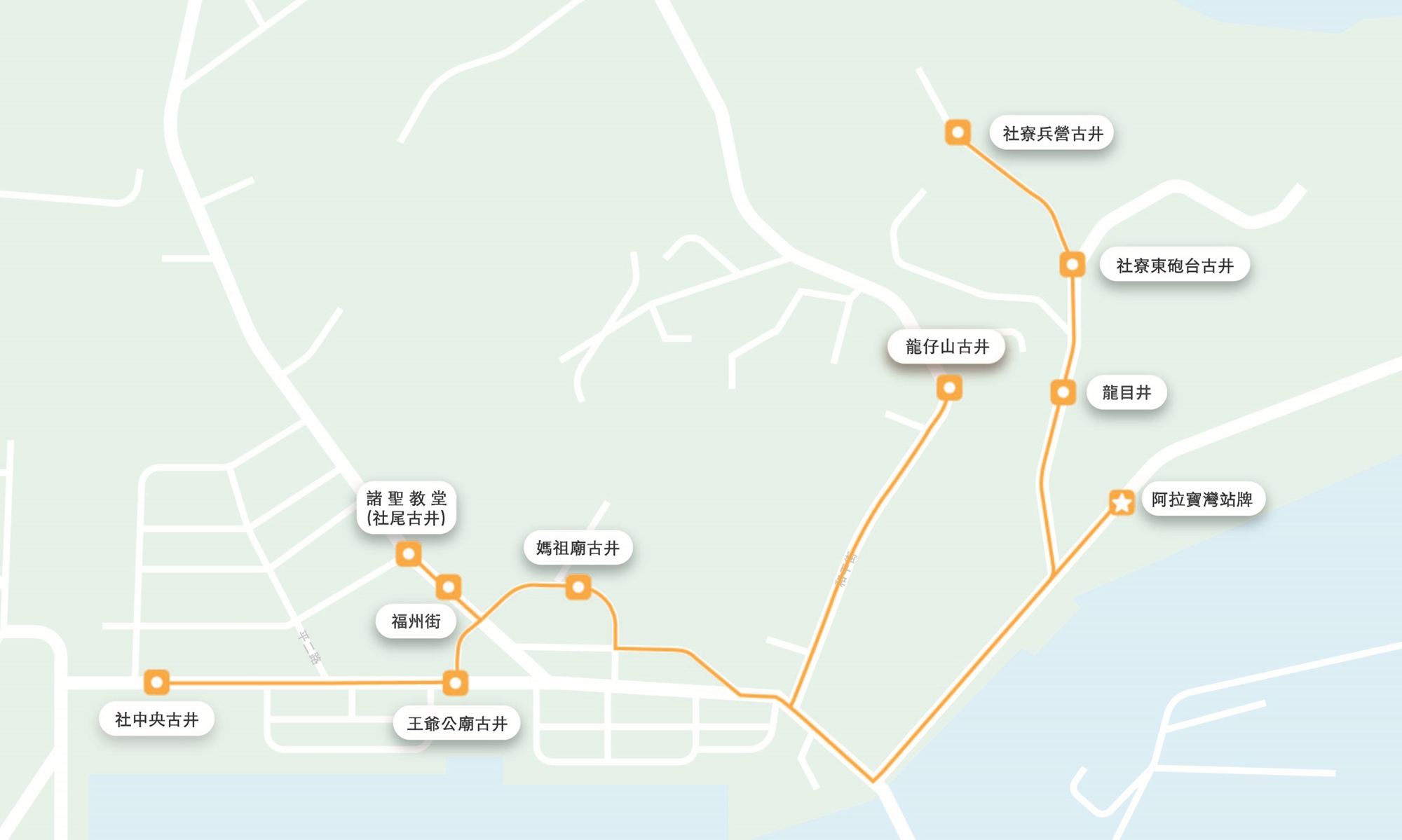 阿拉寶灣站牌集合→龍目井→社寮東砲台古井→社寮兵營古井→龍仔山古井→媽祖廟古井→