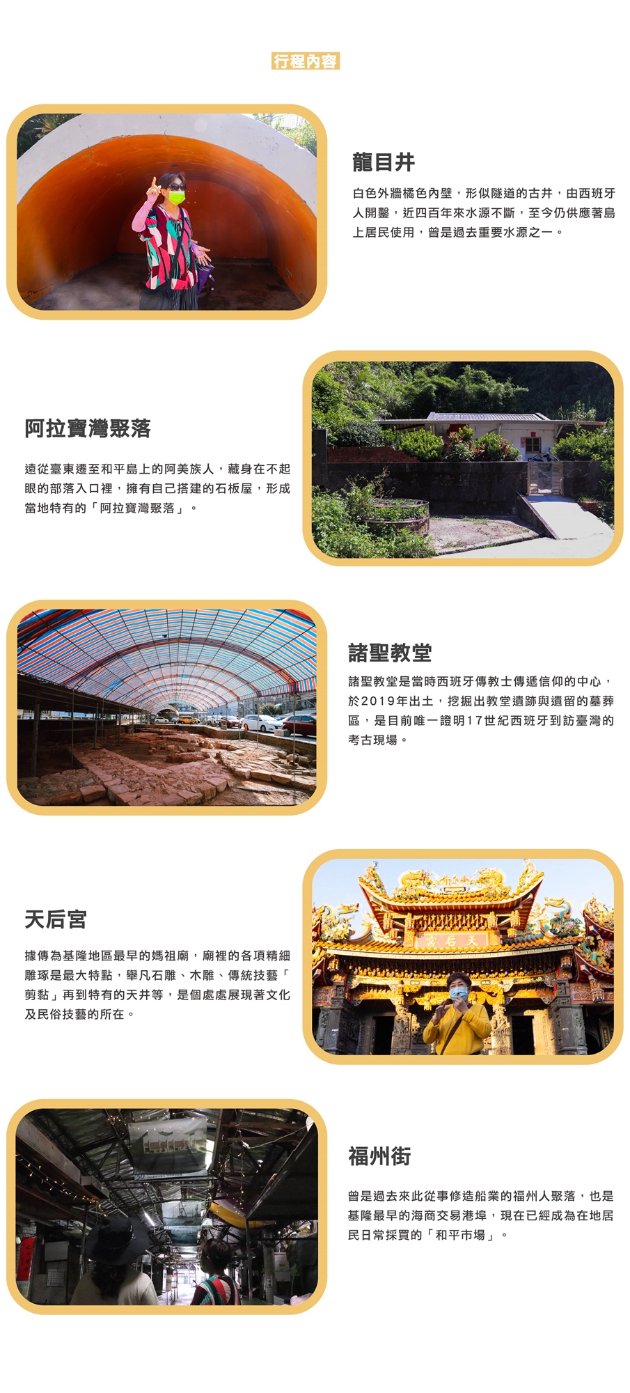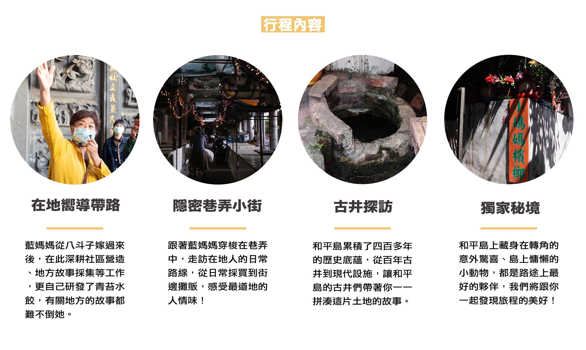 和平島依山傍海,在自來水技術尚未成熟的年代,取得水源不易,使得聚落依著水源發展,因此和平島上遍佈著數個隱密古井,這次就讓在地嚮導藍媽媽帶著你在和平島的巷弄間穿梭,尋找藏身在小巷轉角裡的百年古井,走訪「阿拉寶灣」的阿美族人部落,再到當地信仰中心「天后宮」、市場小弄「福州街」,重現當年「逐水草而居」的日常,體驗最當地的獨家路徑!