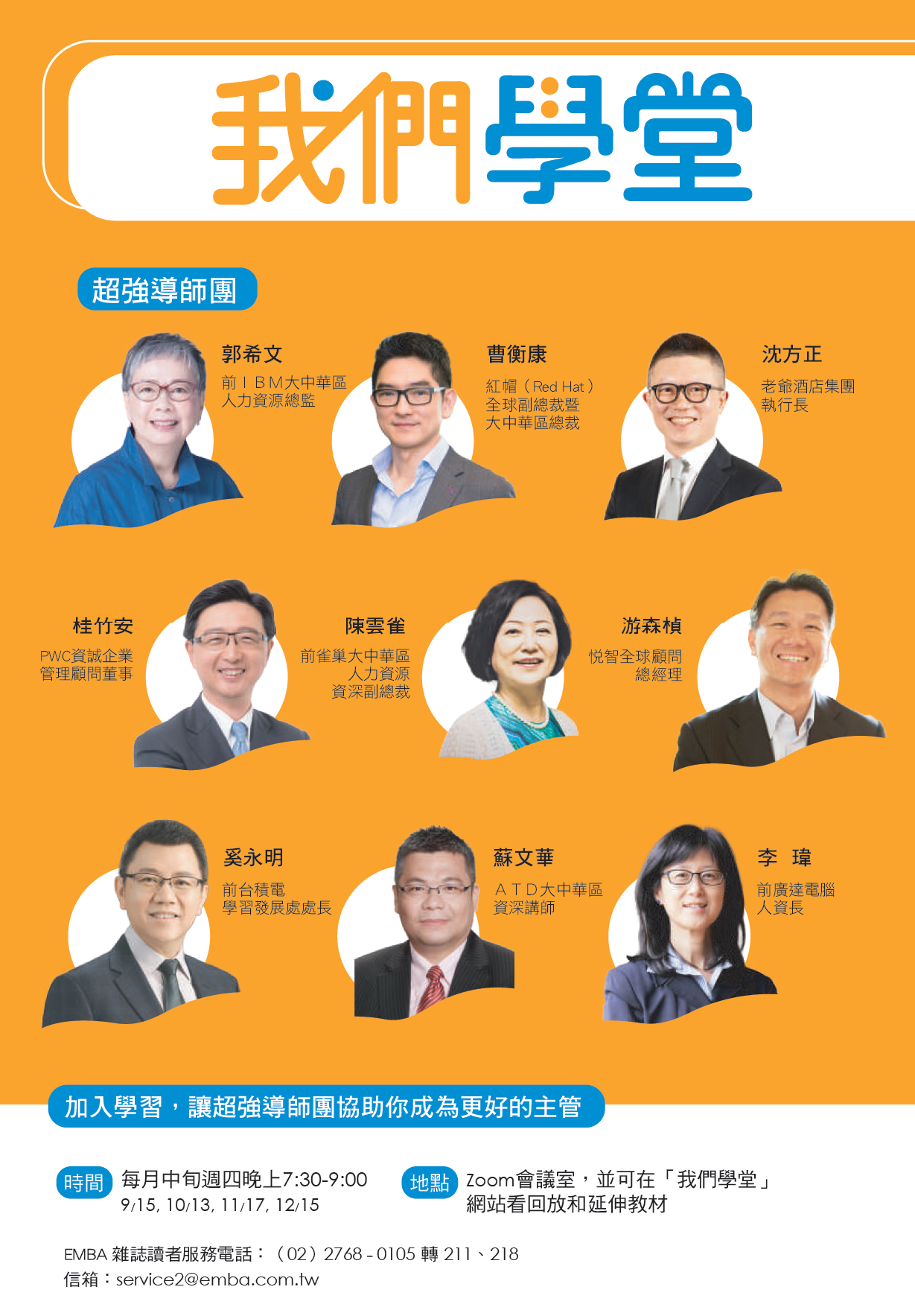 「我們學堂」是EMBA雜誌為新一代主管推出的學習計畫,挑出主管最常遭遇的問題,每月透過一堂線上課,邀請傑出領導人與顧問分享經驗,引導思考,即時解答你的困惑。