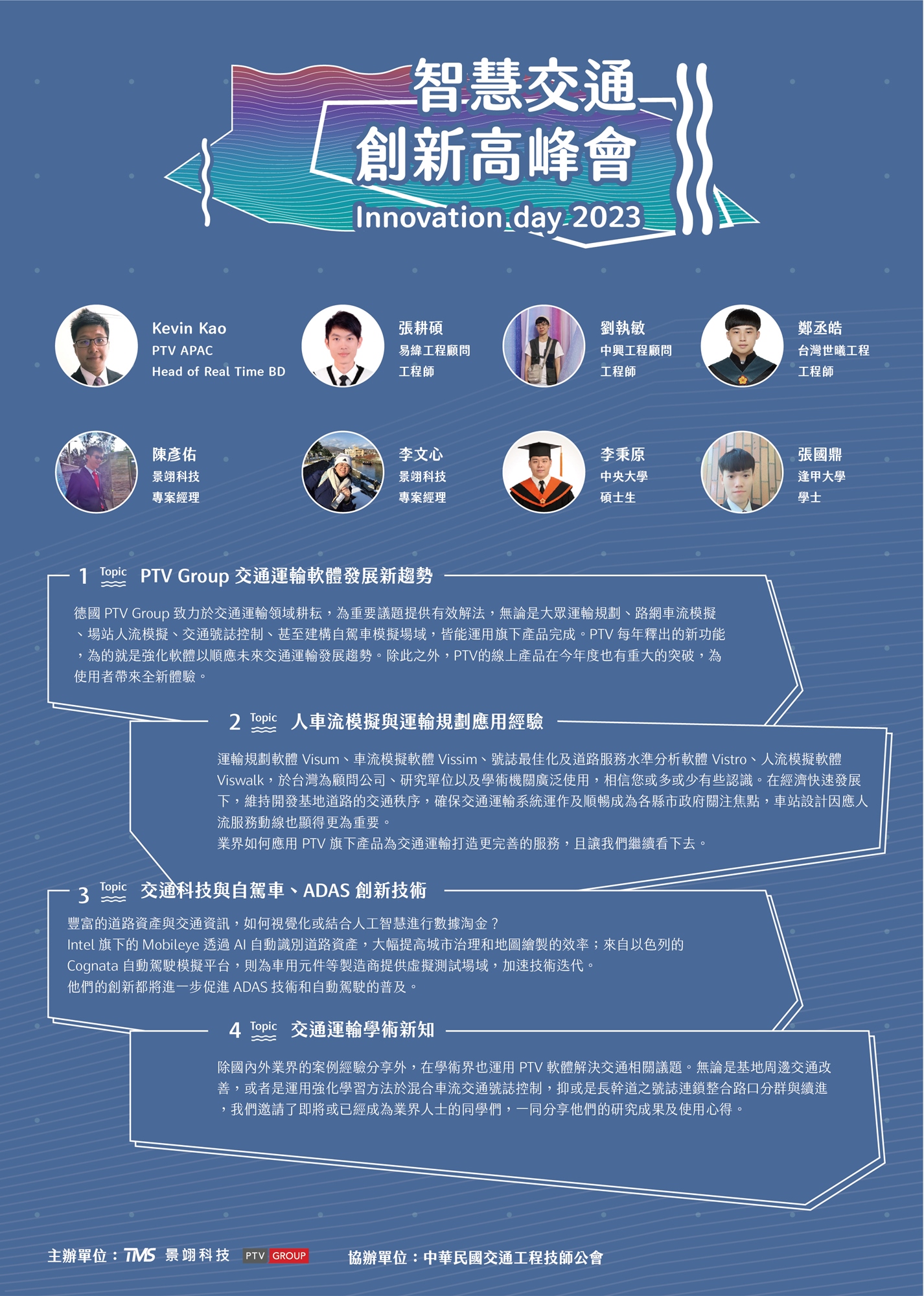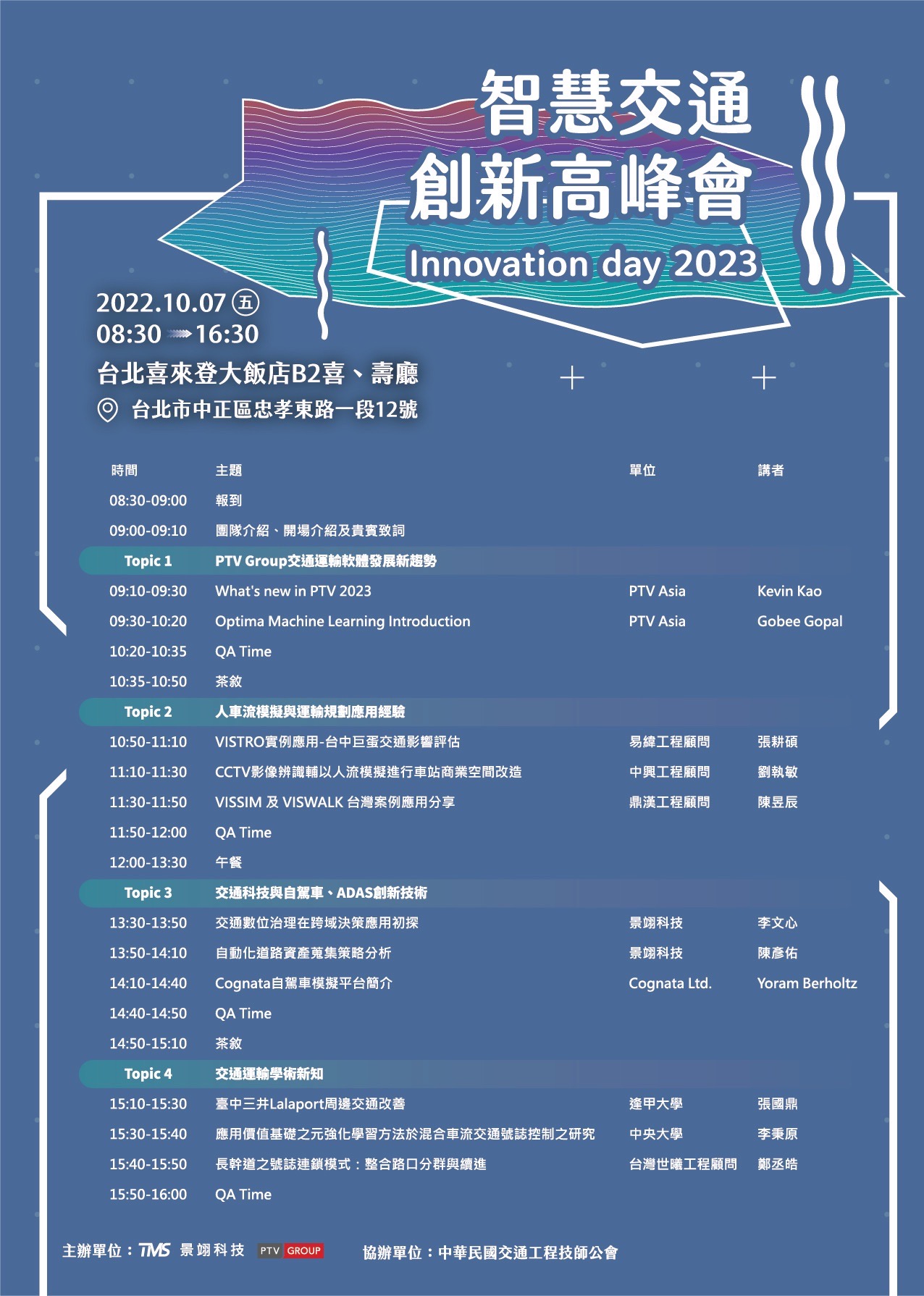 近年來隨著 5G 通訊、AIoT 技術快速發展,為交通運輸應用帶來無限的可能性,提升整體交通運輸不同層次的創新服務,景翊科技與德國 PTV Group 攜手合作,將於 10 月 7 日(週五)台北喜來登大飯店舉辦 2023 智慧交通創新高峰會,藉由國內外的專家分享及學術相互交流,帶您掌握智慧交通新動向。