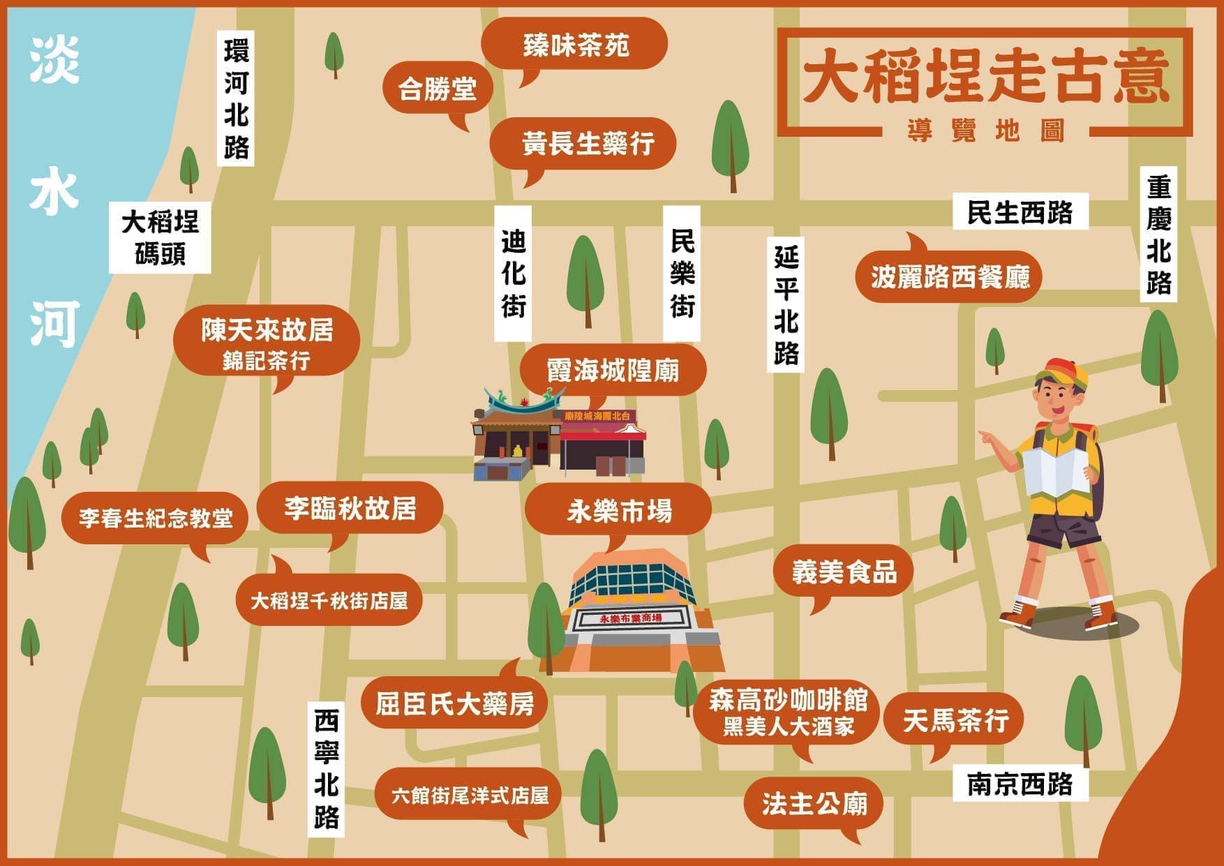 霞海城隍廟→李臨秋故居→大稻埕千秋街店屋→李春生紀念教堂→陳天來故居(錦記茶行)→ 迪化街→臻味茶苑→黃長生藥行→合勝堂→波麗露西餐廳→義美食品(大安醫院舊址)→ 黑美人大酒家(森高砂咖啡館) →天馬茶行→ 法主公廟→六館街尾洋式店屋→ 屈臣氏大藥房→永樂市場