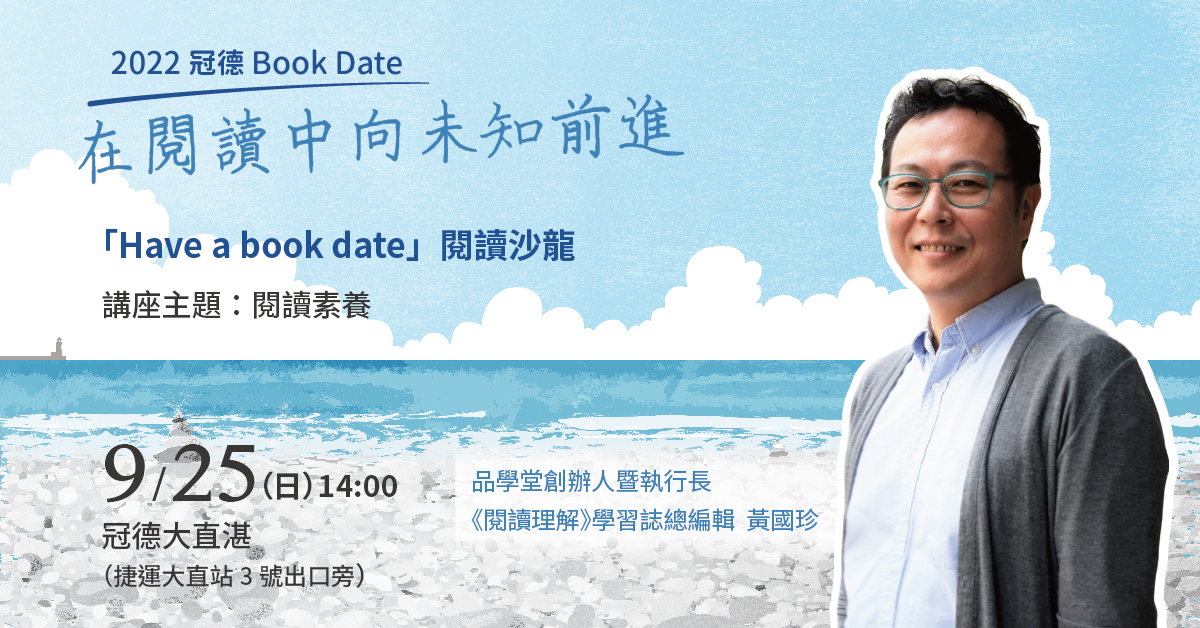 9/25(日) 下午2點,由「品學堂」創辦人暨執行長、《閱讀理解》學習誌總編輯黃國珍老師與大家聊聊「閱讀」這件事,回歸閱讀的本質,瞭解如何從字裡行間創造心靈與人生的更大收穫。閱讀沙龍限額50名,歡迎與黃老師「Have a Book Date」!