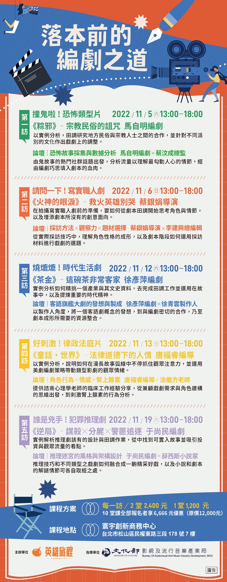 本課程以目前市場上最受歡迎之類型,如恐怖、愛情、時代、職人、推理,精心挑選出近年熱播作品,邀請知名編劇、導演為主要講師,搭配論壇與談人-曾與影視 專業人士合作的數據、新聞、文化、諮商專家,從他們的經驗帶給學員關於劇本前期研究與田野調查的深度知識。