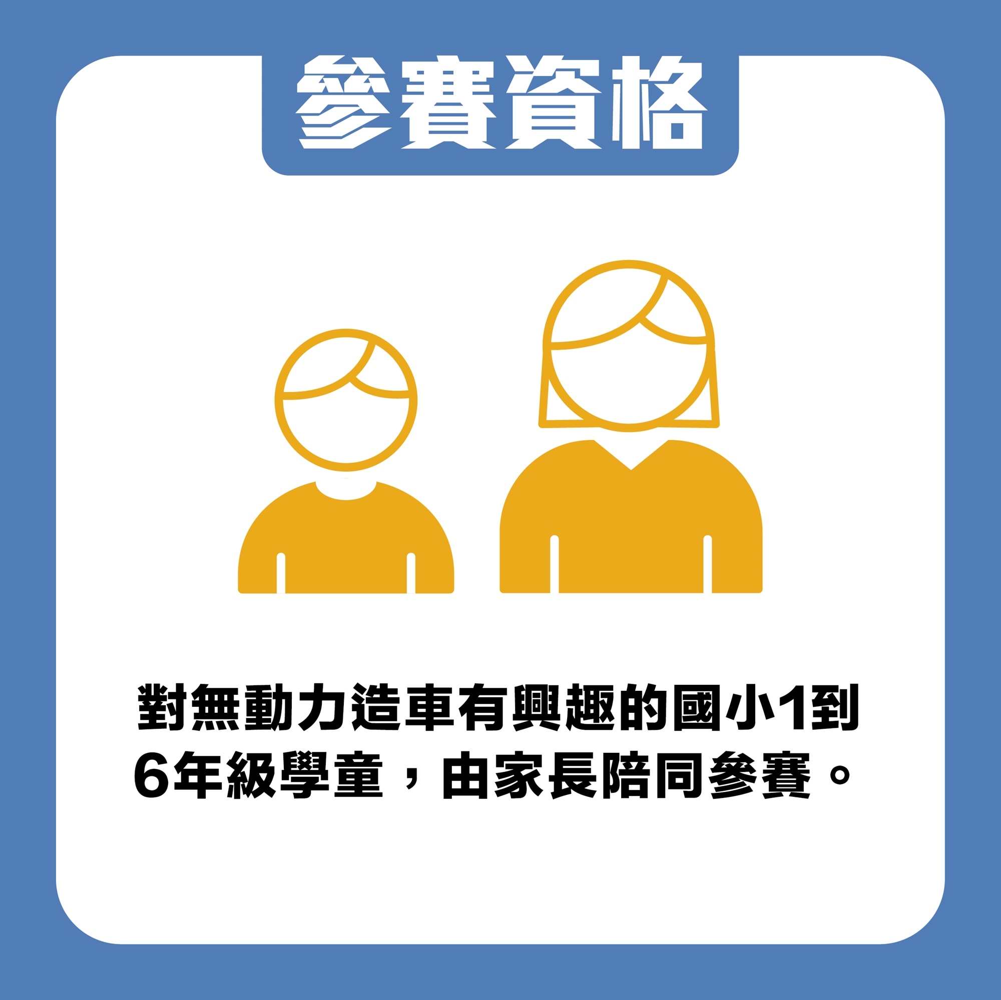 1. 參賽選手以國小學童個人參與競賽,每位選手只能有一名成人(家長)於組裝區陪同,其餘同行家人請於觀賽區觀看賽事。