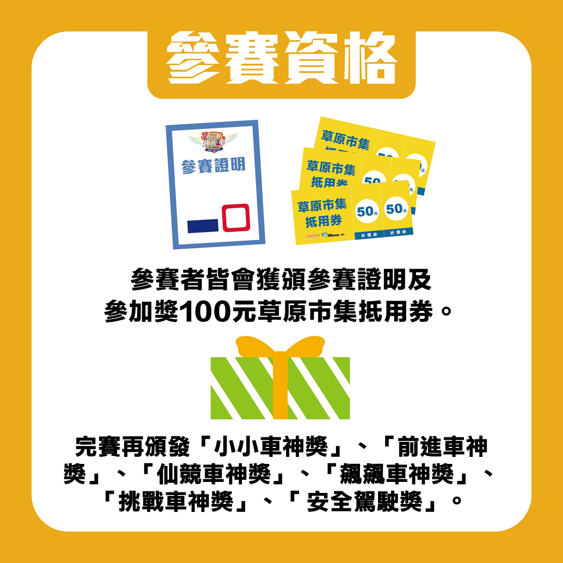 參賽者皆會獲頒參賽證明及11月6日西拉雅趣飛車草原市集100元抵用劵一張。