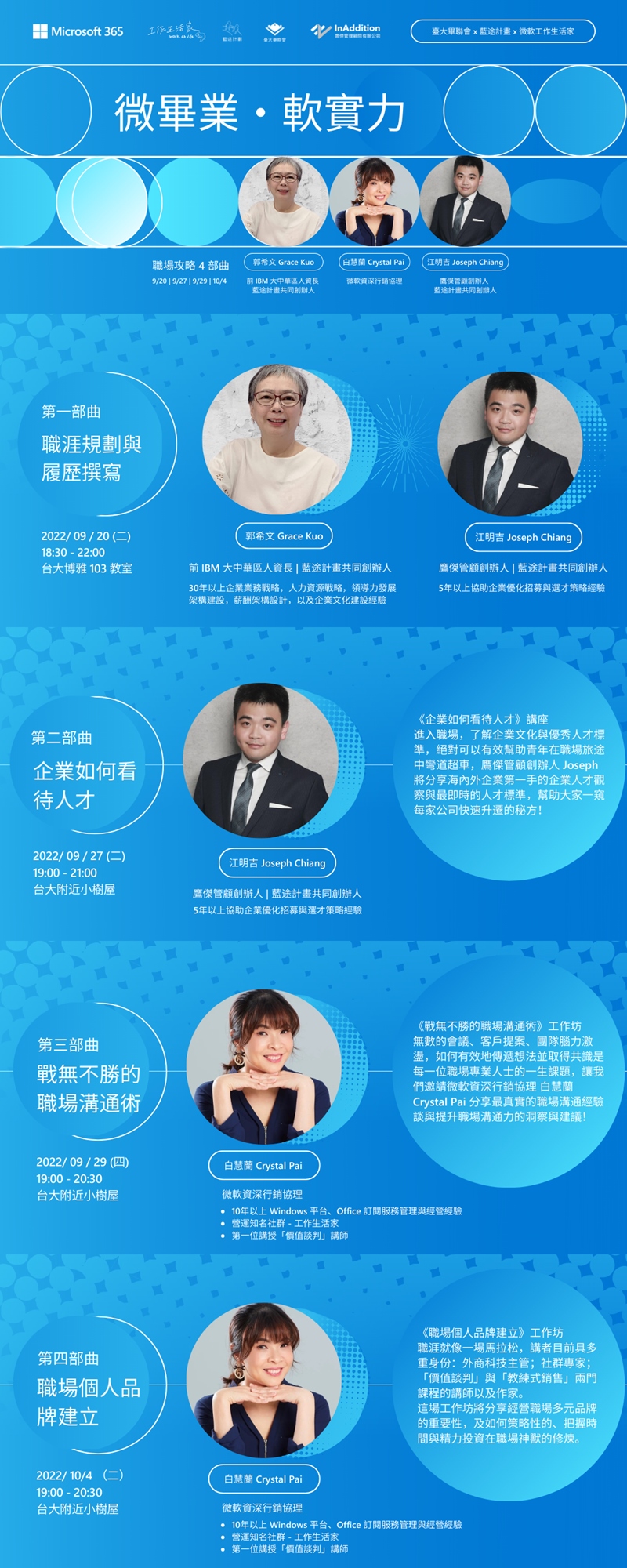 為知名職涯社群《藍途計畫》、《微軟工作生活家》、《台灣大學畢聯會》主辦的新鮮人職涯活動。開設一系列畢業季職涯相關活動,包含2場講座、2場工作坊及職涯諮詢,提供待畢業生職涯指引與建議