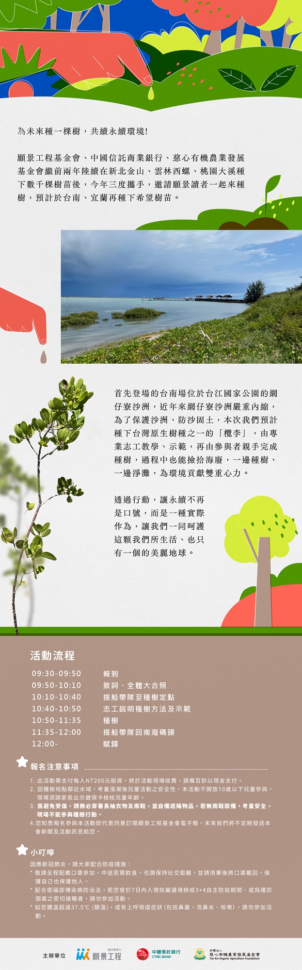 (4) 因種樹地點鄰近水域,考量漲潮後兒童活動之安全性,本活動不開放10歲以下兒童參與,現場須請家長出示健保卡檢核兒童年齡。