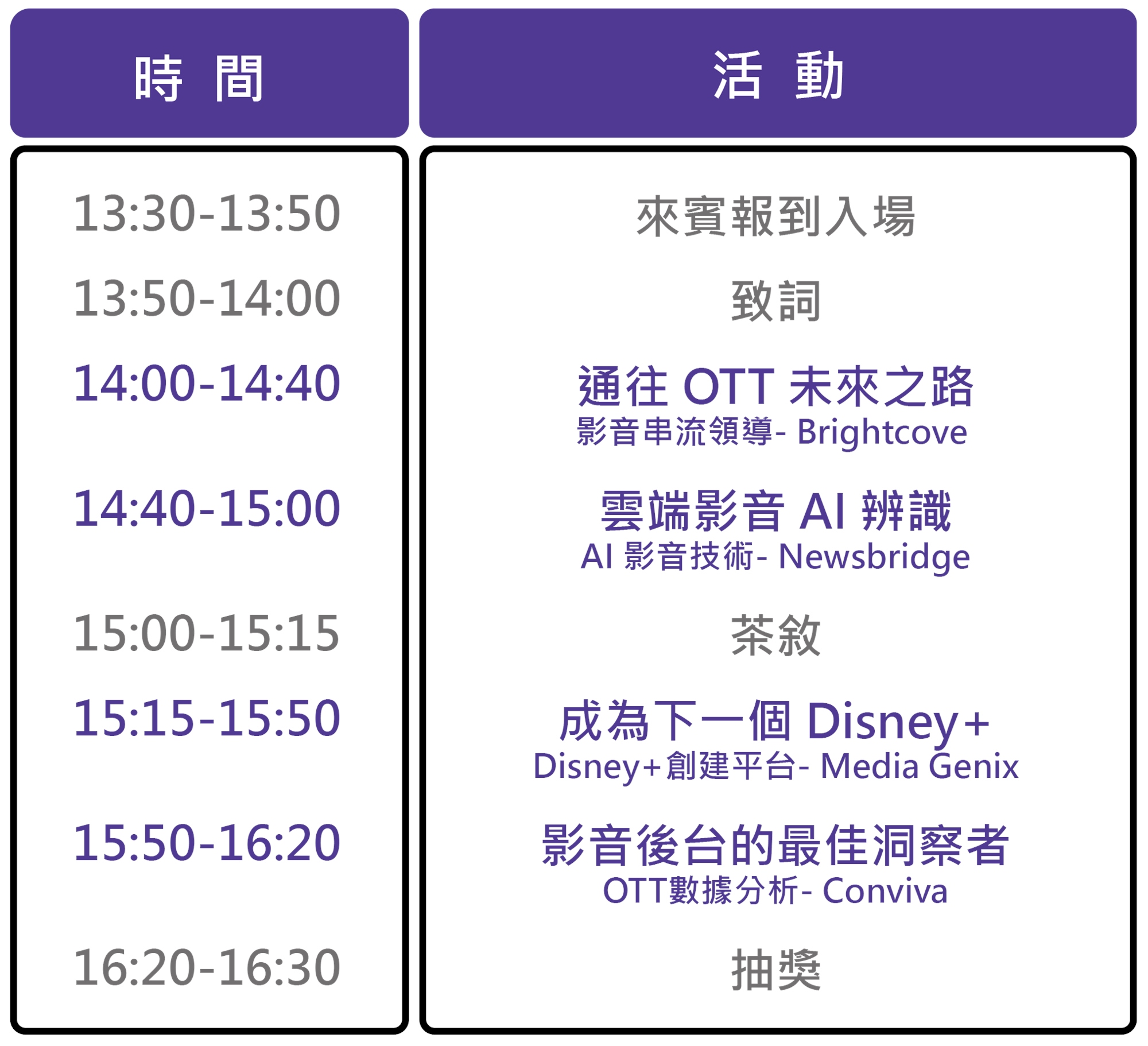 自 2020 年疫情全面衝擊媒體生態,影音串流服務壯大,同時也愈加重視平台使用體驗。此次 研討會將帶大家探究全球影音串流的領導業者 Brightcove,以及創建 Disney+ 的世界一流品牌 Media Genix;強大數據分析品牌 Conviva 與擅於 AI 技術運用的品牌 Newsbridge 如何打造高品質影音平台。透過此次活動,從影音串流的平台架設、使用介面優化、後台數據分析,甚至 AI 技術的擴展,將把全套前所未有的影音串流解決辦法呈現給大家,絕對擴大你對 OTT 技術的想像!