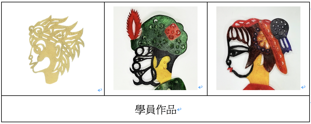 課程中,我們欲從過去傳統圖像中,找出皮影戲偶圖像設計脈絡給學員,包含偶頭的衣帽裝飾、面部特徵,偶身的服飾特徵、吉祥圖案以及頭與身的搭配邏輯,整合傳統皮影戲偶的製作脈絡,並從「無形文化資產」與「有形文化資產」在皮影戲偶製作上的呈現,讓學員理解傳統工藝技術和內涵皆有其在文化保存上的重要性。