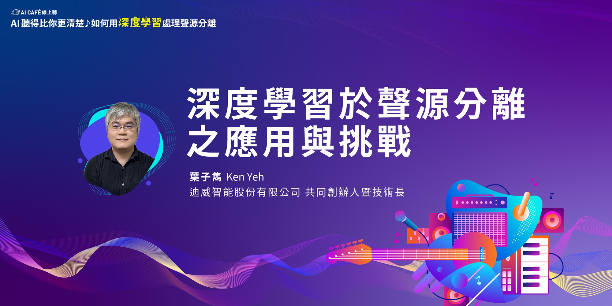 特別邀請迪威智能 DeepWave 共同創辦人暨技術長—葉子雋,他在音樂的辨識、分類與解析上有著深厚的研究,以提供音訊 AI 落地服務為基礎,介紹線上 AI 音源分離產品技術,讓對於想利用 AI 於聲音產業的專業工作者,全面了解深度學習模型如何達成音源分離效果,及聲學相關技術應用。