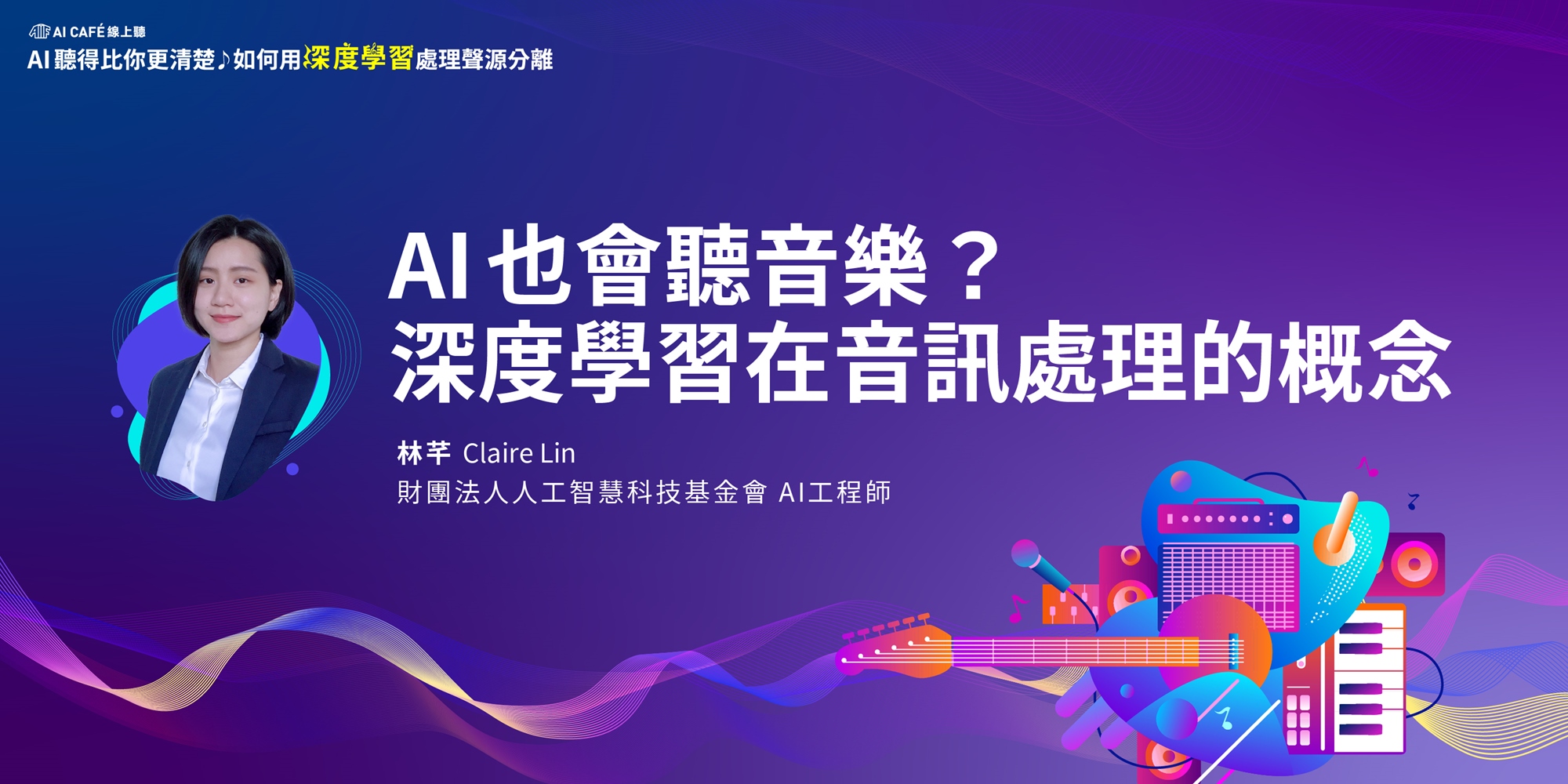 由人工智慧科技基金會 AIF AI 工程師—林芊,以深入淺出的介紹,完整建立你在深度學習的聲學概念及 AI 用於音樂與語音的處理。就算不是 AI 工程師或資通訊科技工作者,也能夠理解的原理架構分享。