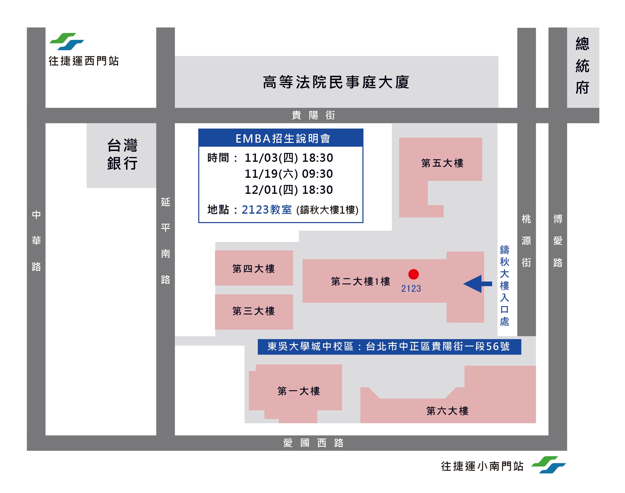 112學年度東吳EMBA招生說明會將舉辦3個場次,分別於11/3(四)、11/19(六)、12/1(四)在東吳大學城中校區鑄秋大樓2123會議室舉辦。