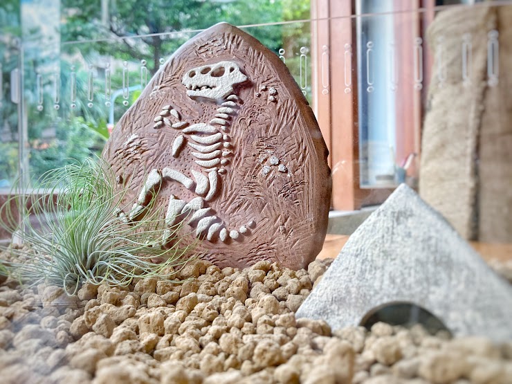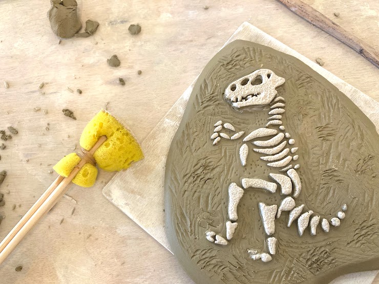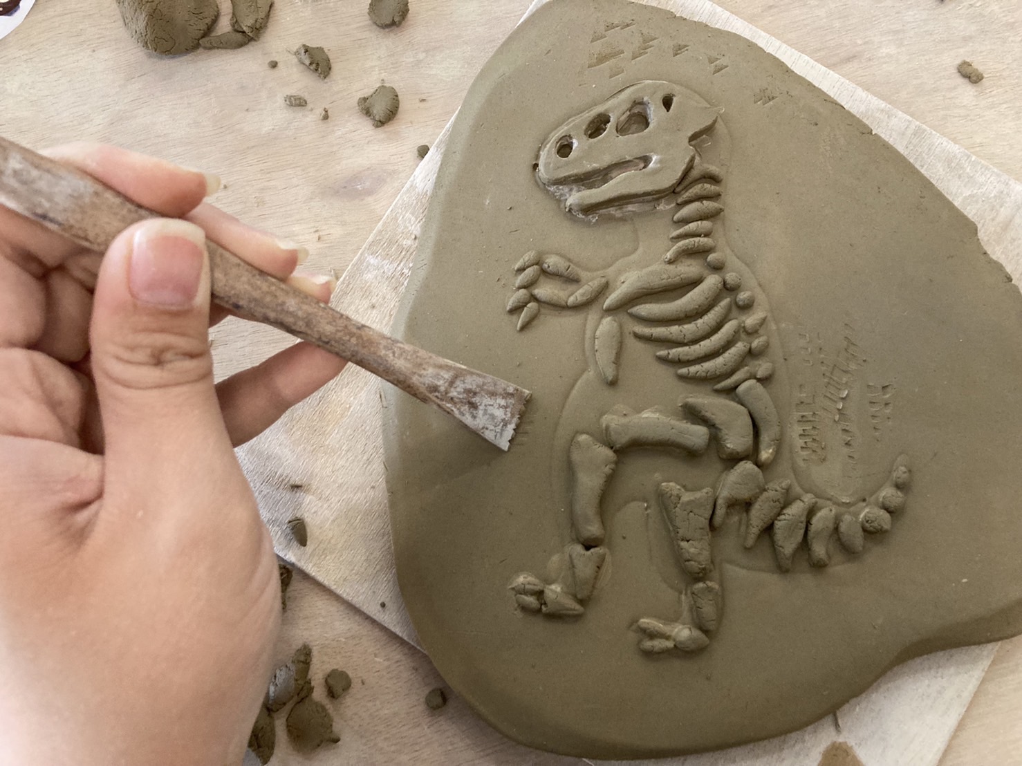 ▧ 課程內容|化身成小小雕刻家,觀察恐龍骨頭並於自製陶板上雕刻、捏塑出半立體的恐龍造型。👉🏻做陶技巧:描圖、觀察、土板與土條製作、化妝土運用