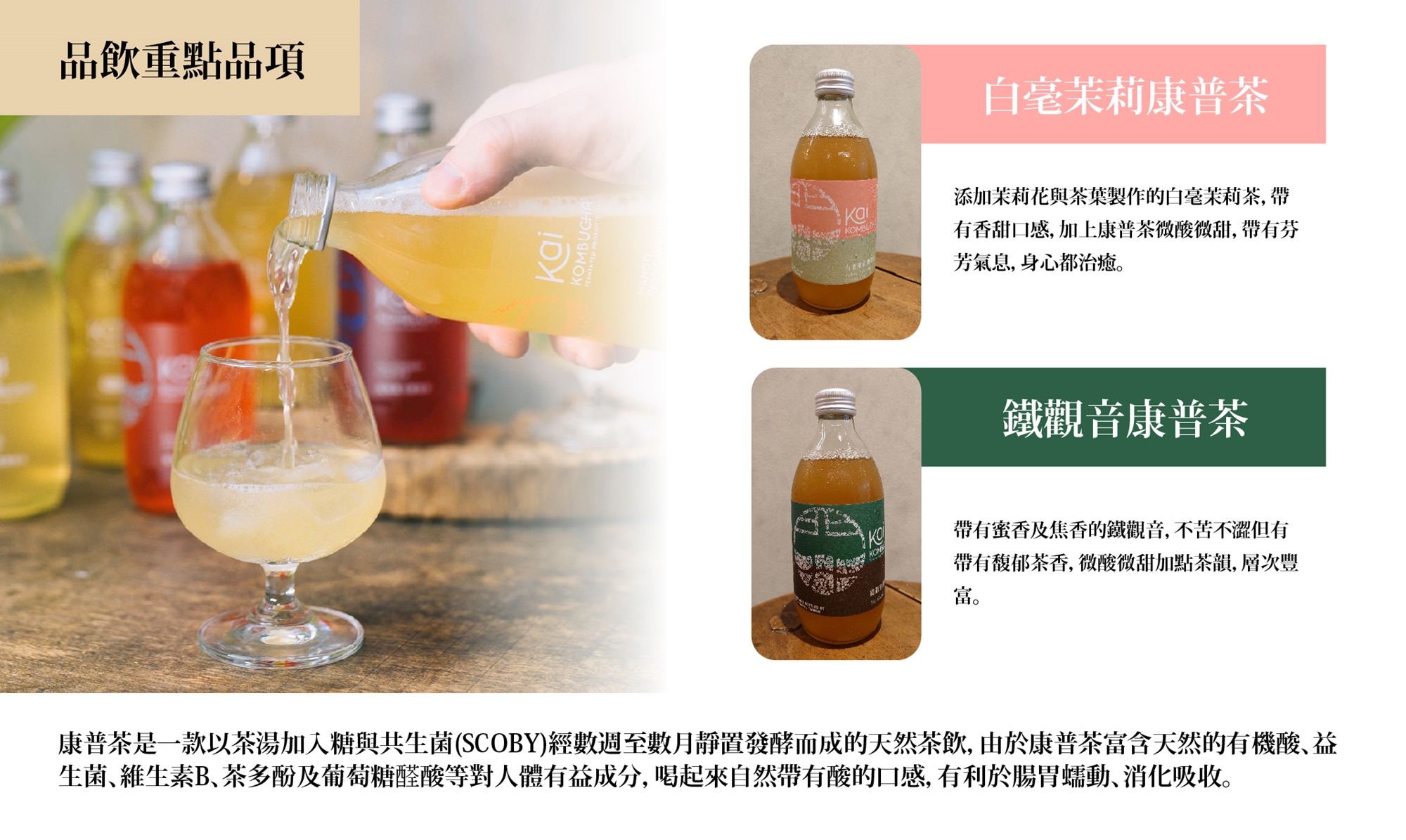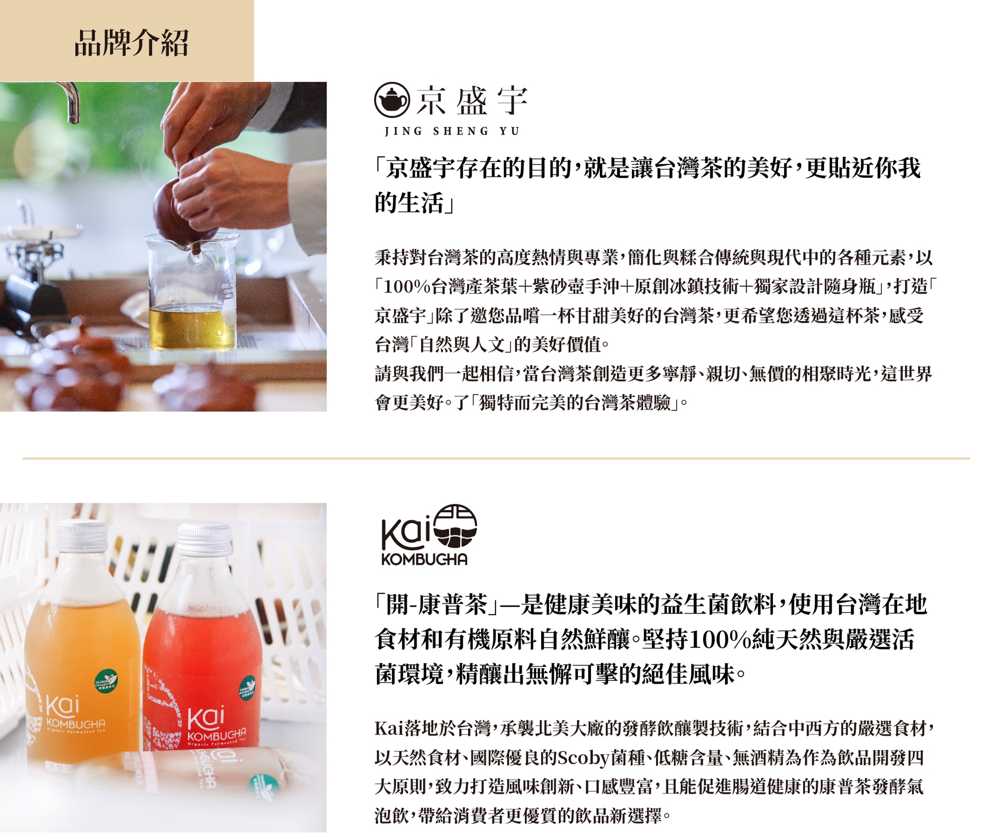 京盛宇很開心有機會和 Kai開康普茶合作開發兩款茶風味為主的康普茶:「白毫茉莉、鐵觀音」,Kai開康普茶創辦人Ross在京盛宇podcast節目「台灣茶你好」訪談時說: