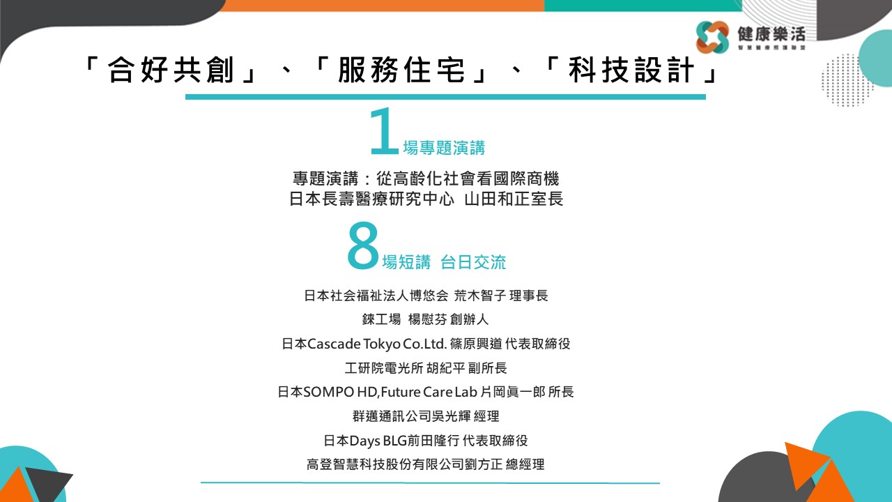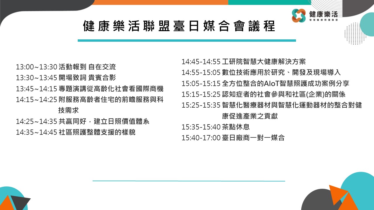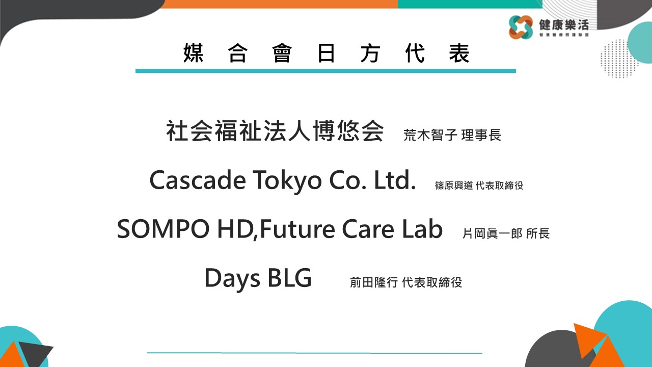 本次基於日本長期與臺灣的友好關係,加上產業高度互補,是臺灣發展智慧長照產業的重要夥伴;為協助臺灣拓展及了解日本智慧長照產業之合作契機,本媒合會特別邀請日本長壽醫療研究中心山田和正室長來臺專題演講「從高齡化社會看國際商機」,並邀日本機構、醫療機構、日照中心、保險業等代表與會介紹企業特色與合作方向,以從中標竿學習並找到後續合作契機。