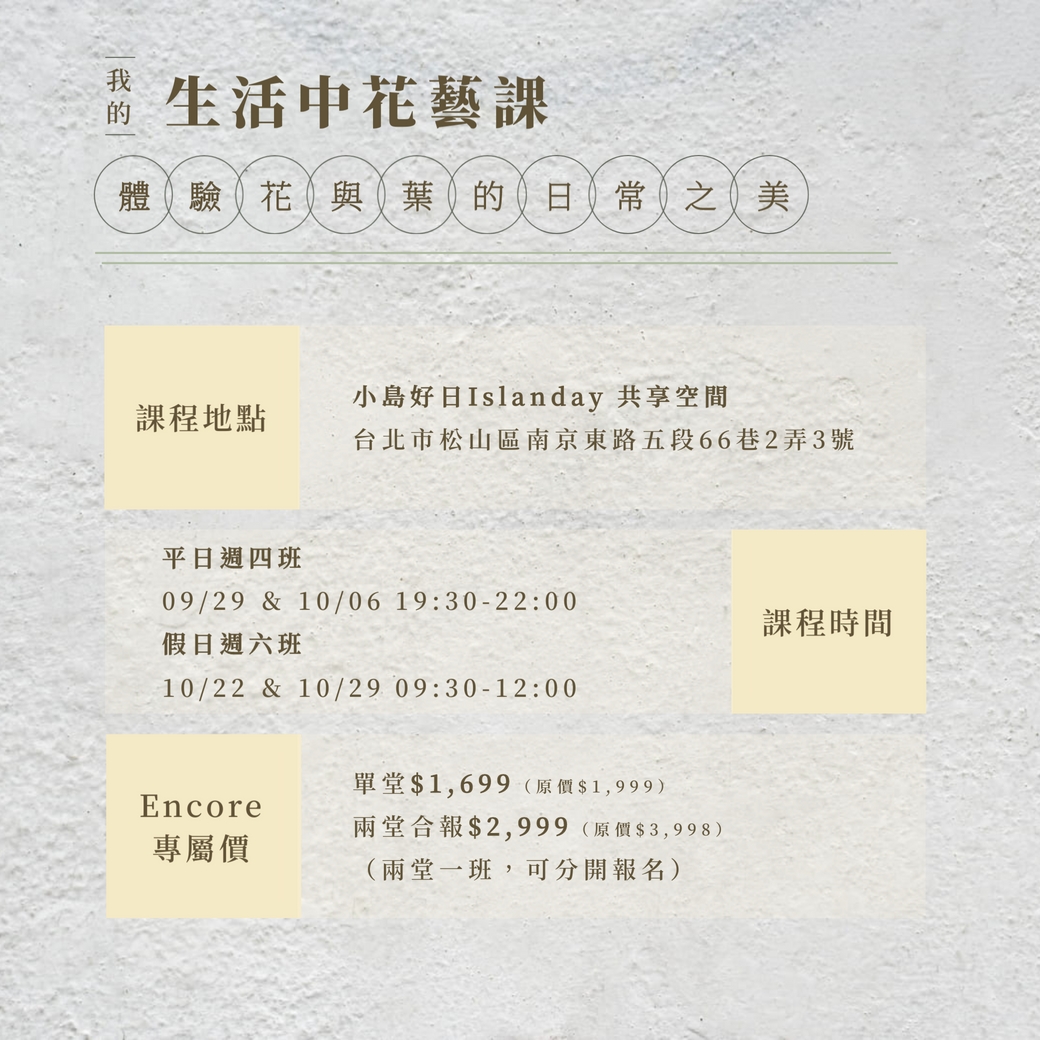 - 防疫期間請全程配戴口罩,當日若有發燒 (額溫 ≧ 37.5℃) 或有呼吸道症狀者,請於課程當天11:00前告知,課後將協助寄送課程花材包(郵資自行負擔)。