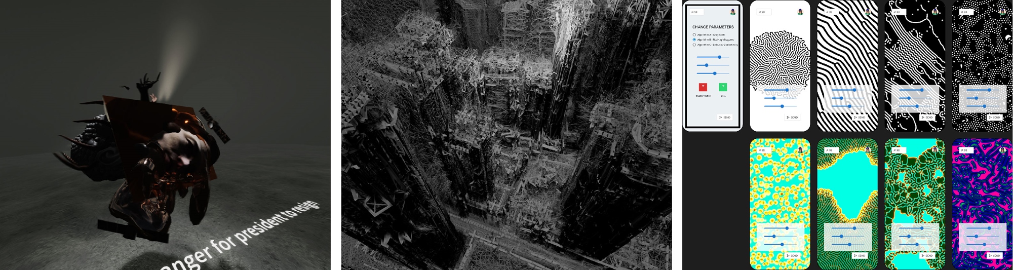 此次邀請藝術家以「5G雲端運算美學平台」為核心,共同展現沉浸展演的多樣性與異地共演的即時性。藝術家魏廷宇透過關鍵字搜尋而產生的模型與聲響,展開超現實的推演,將由直視混沌,創造新空間;香港藝術家林欣傑、韓家俊透過即時演算,使消逝中的香港地景以訊息記錄存檔,移植重置成為體驗的記憶;藝術家蔡奇宏則建置一套即時多人互動介面,透過手機與藝術家們對接,同時也將異地的民眾串聯在一起。