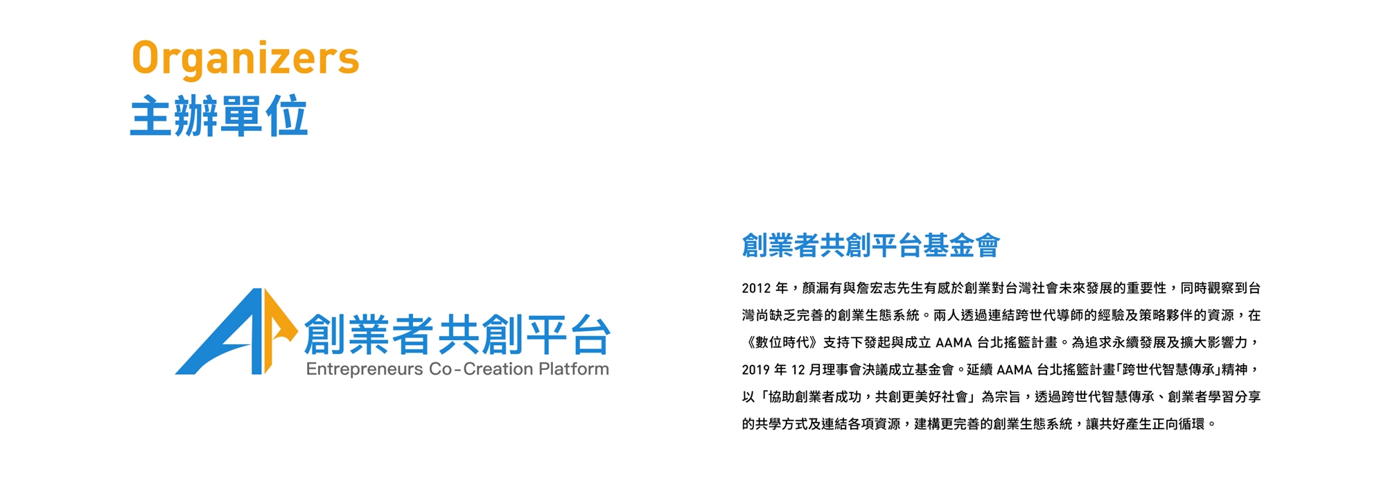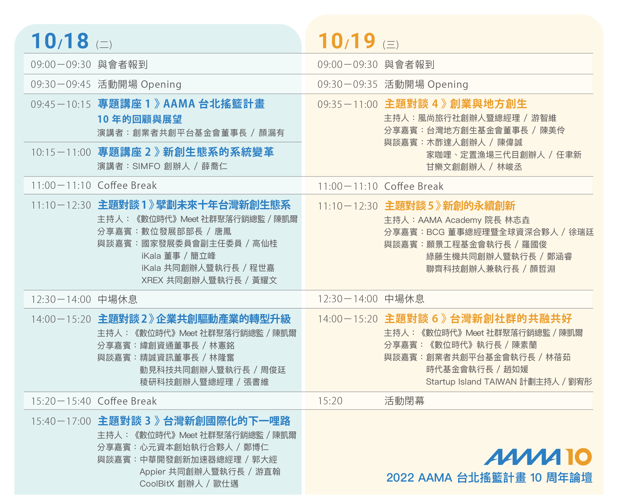 回顧 2012 年 AAMA 台北搖籃計畫推動之初,台灣新創產業環境仍是一片荒漠,以著重智慧傳承的學習步調出發,逐年累積投入的導師與創業者,摸索出協助創業者的學習模式與資源連結。十年來,加入 AAMA 台北搖籃計畫平台的新創企業也在各領域嶄露頭角,不只帶動企業數位轉型,也為社會創新帶來充沛的動能,甚至成為台灣新創發展的指標。站在回顧上個十年、展望下一個十年的此刻,我們特別以創業政策建言、企業共創、國際化、地方創生、永續創新、社群共融六大主題,邀請新創社群各方夥伴一起展開對話,共同探索台灣新創的未來!