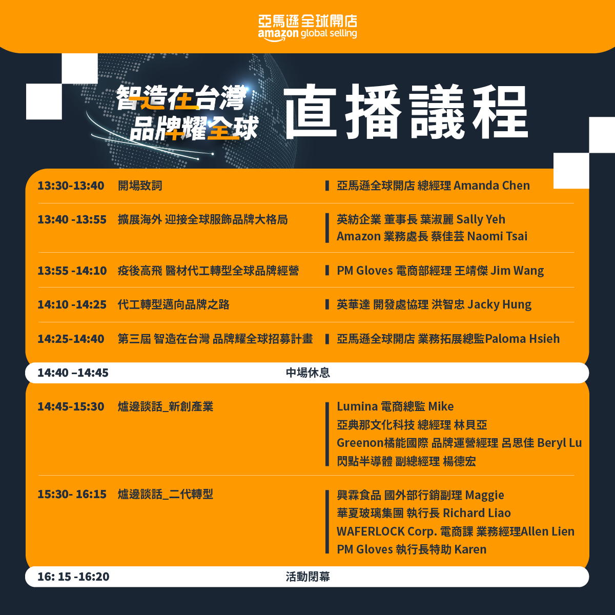 「智造在台灣 品牌耀全球」為台灣亞馬遜全球開店唯一官方主辦的賣家培育計畫。自 2020 年設立,旨在長期整合跨境生態圈資源,針對每一屆參與企業,為期 1 年的免費陪跑,從零到一孵育台灣品牌,加速推展亞馬遜電商外銷,為台灣跨境電商樹立品牌標竿集群。
