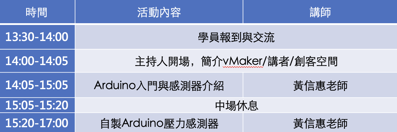 Maker的好朋友之一Arduino,你一定不陌生!上半場將會先介紹Arduino的入門,以及基礎電路、程式邏輯,Arduino小小的體積,集控制晶片和燒錄功能於一身,再利用ArduBlock圖形化介面來熟悉Arduino與各種感測零件的基礎知識、麵包版的使用與控制LED燈的方法,除了能提供學員們使用Arduino的新想法外,亦能激發出跨領域的創新應用,打造出不同的作品。