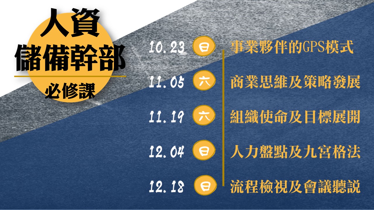 好消息!首次由新竹人資協會及竹科人資主管聯誼會聯合主辦的「人資儲備幹部的必修課」,特別邀請具有多元學術訓練及紮實實務經驗的簡博浩老師親自規劃及授課,透過主題式的設計,深入淺出的個案研討,以完整架構協助學員建立人資儲備幹部必須具備的重要管理觀念及核心能力。