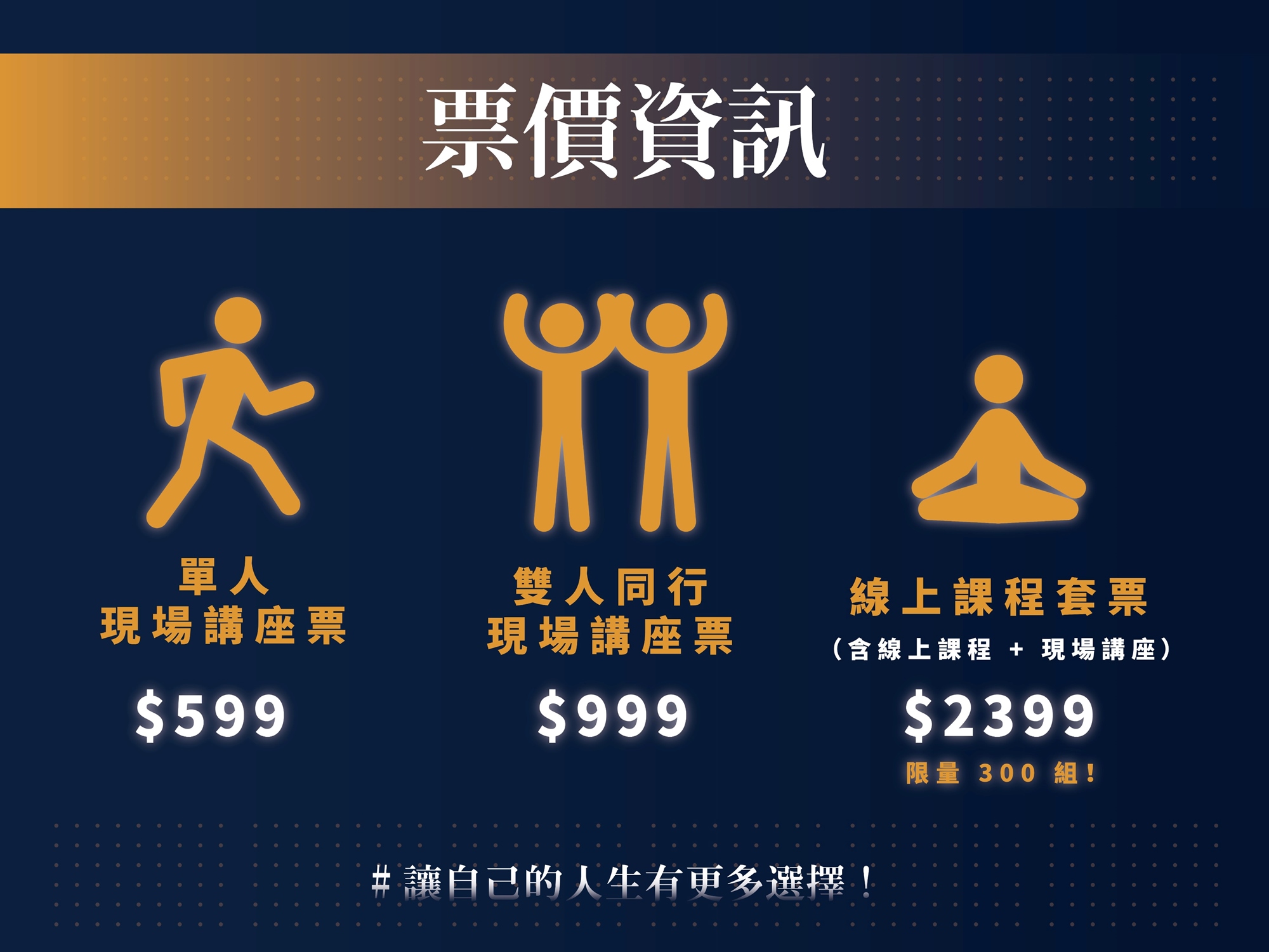 - 線上課程套票(NT$2399):此票券方案含現場講座票 1 張 + 線上課程 1 組