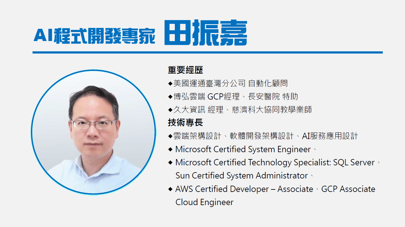 - 雲端架構設計、軟體開發架構設計、AI服務應用設計