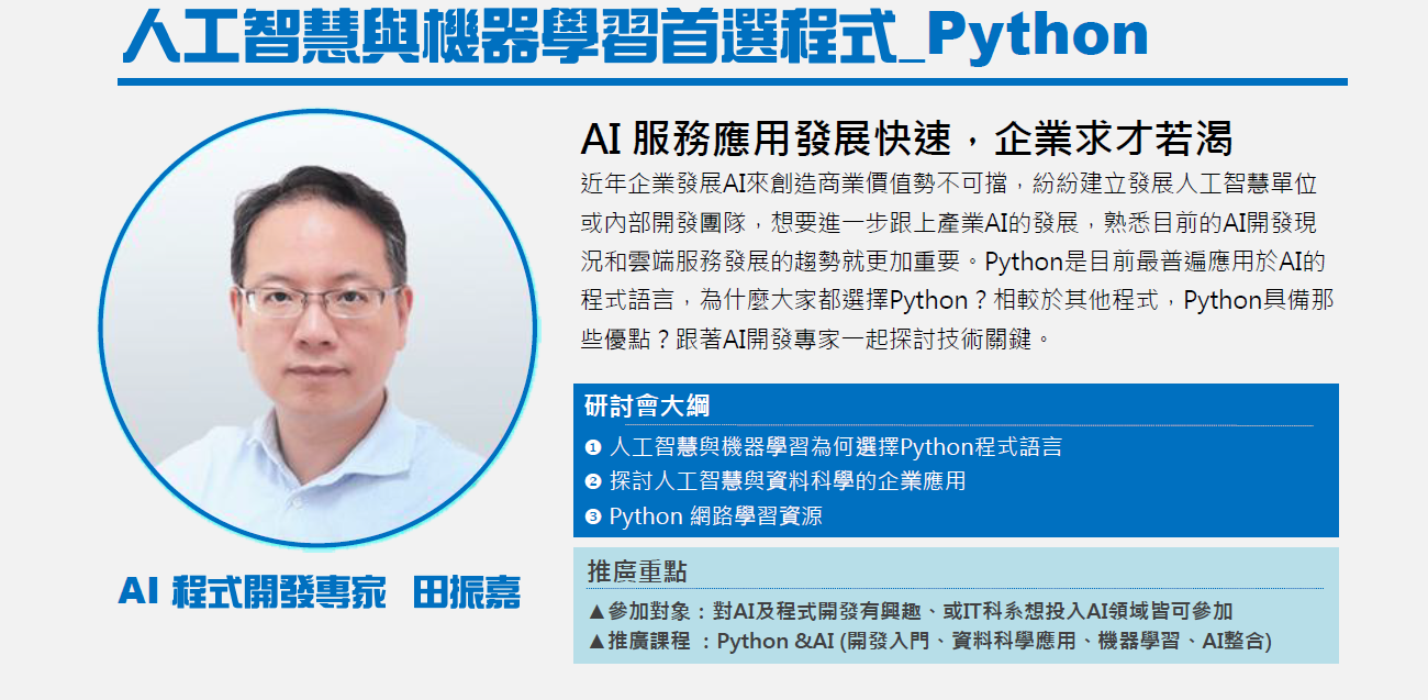 近年企業發展AI來創造商業價值勢不可擋,紛紛建立發展人工智慧單位或內部開發團隊,想要進一步跟上產業AI的發展,熟悉目前的AI開發現況和雲端服務發展的趨勢就更加重要。Python是目前最普遍應用於AI的程式語言,為什麼大家都選擇Python?相較於其他程式,Python具備那些優點?跟著AI開發專家一起探討技術關鍵。