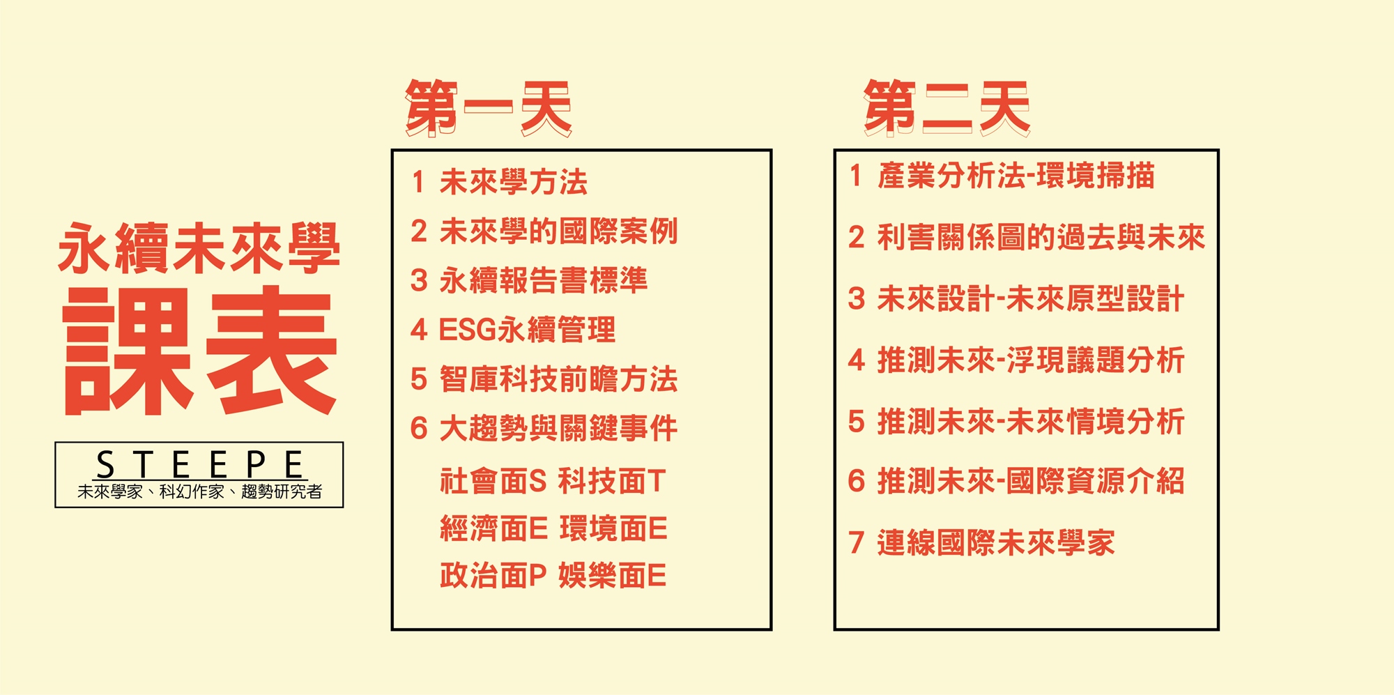 本課程以「未來學」為基礎,帶出「永續發展」的脈絡與策略,並結合國家智庫的科技前瞻方法,探索未來產業與未來社會,根據未來10到20年的生活情境,設定永續願景,並回推現在的策略,最後介紹永續報告書GRI、TCFD、SASB等國際標準,統整執行永續的成果。