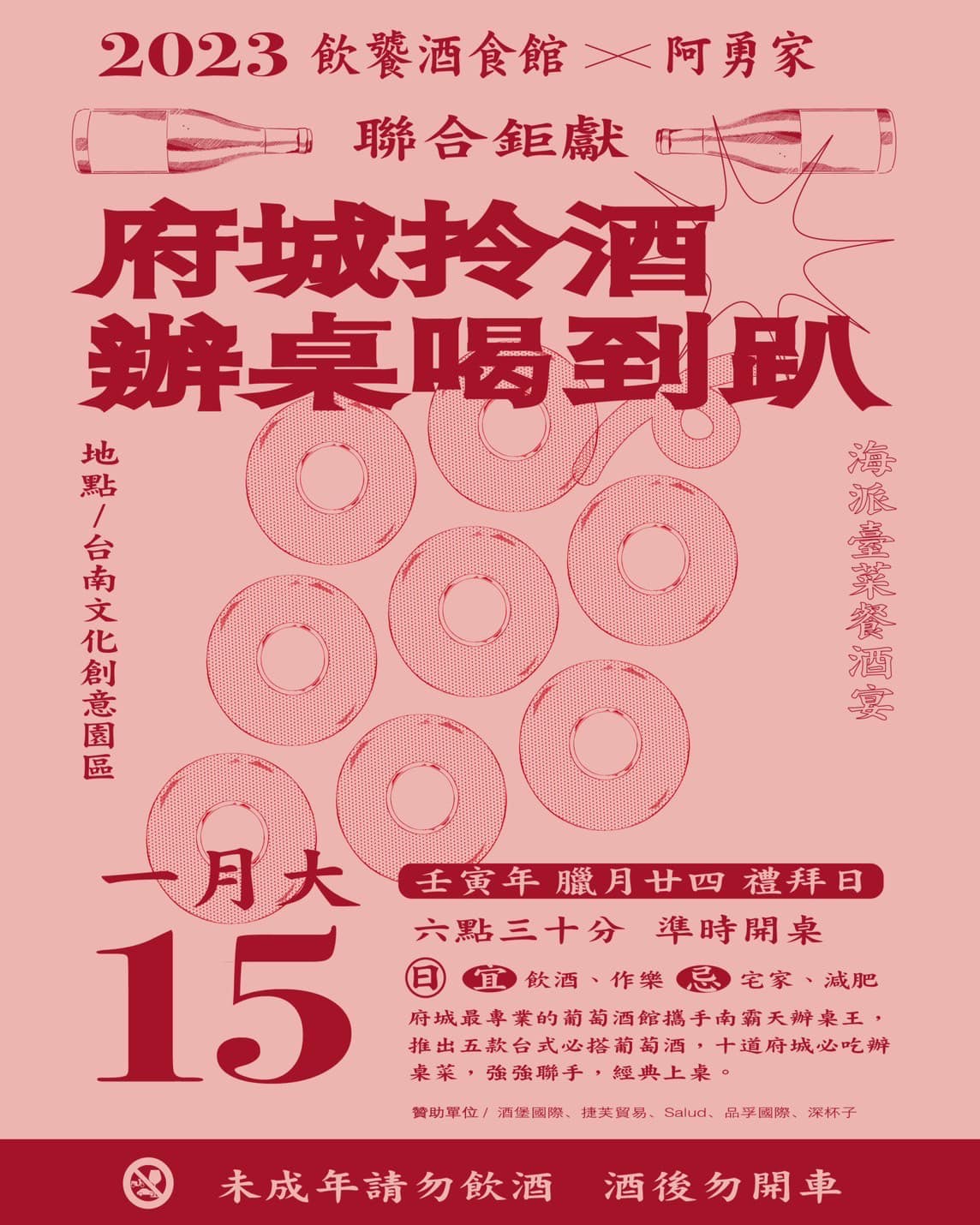 活動最後一天的壓軸,由台南在地專業葡萄酒吧「飲饕」聯合台南宴席南霸天「阿勇家」,舉辦富有府城生活底蘊的葡萄酒辦桌,推出一系列精彩酒宴🥂